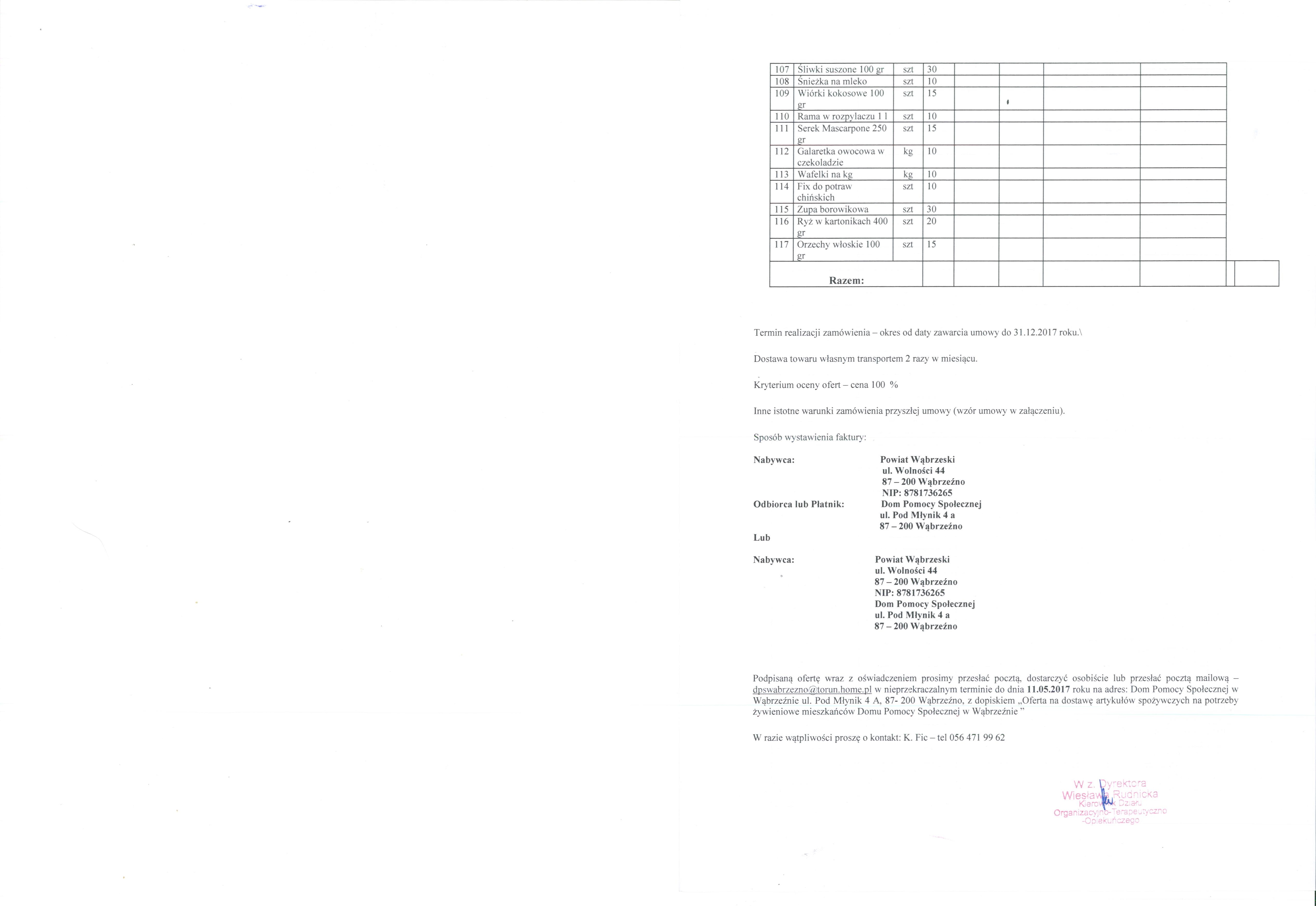 Podpisaną ofertę wraz z oświadczeniem prosimy przesłać pocztą, dostarczyć osobiście lub przesłać pocztą mailową – dpswabrzezno[at]torun[dot]home[dot]pl w nieprzekraczalnym terminie do dnia 11.05.2017 roku na adres: Dom Pomocy Społecznej w Wąbrzeźnie ul. Pod Młynik 4 A, 87- 200 Wąbrzeźno, z dopiskiem „Oferta na dostawę artykułów spożywczych na potrzeby żywieniowe mieszkańców Domu Pomocy Społecznej w Wąbrzeźnie ”