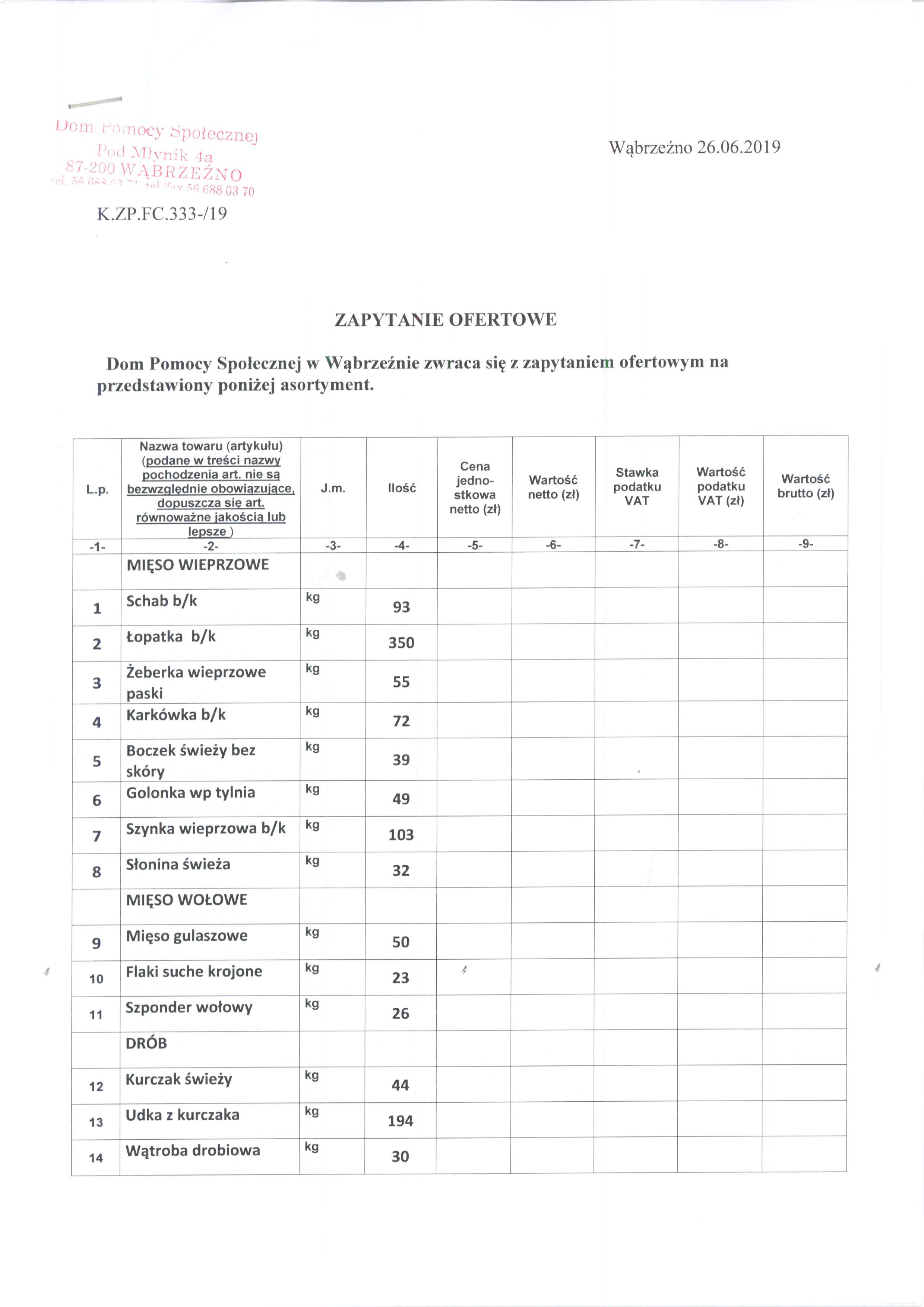 Zapytanie ofertowe na dostawę mięsa i artykułów wędliniarskich na potrzeby żywieniowe mieszkańców Domu Pomocy Społecznej w Wąbrzeźnie