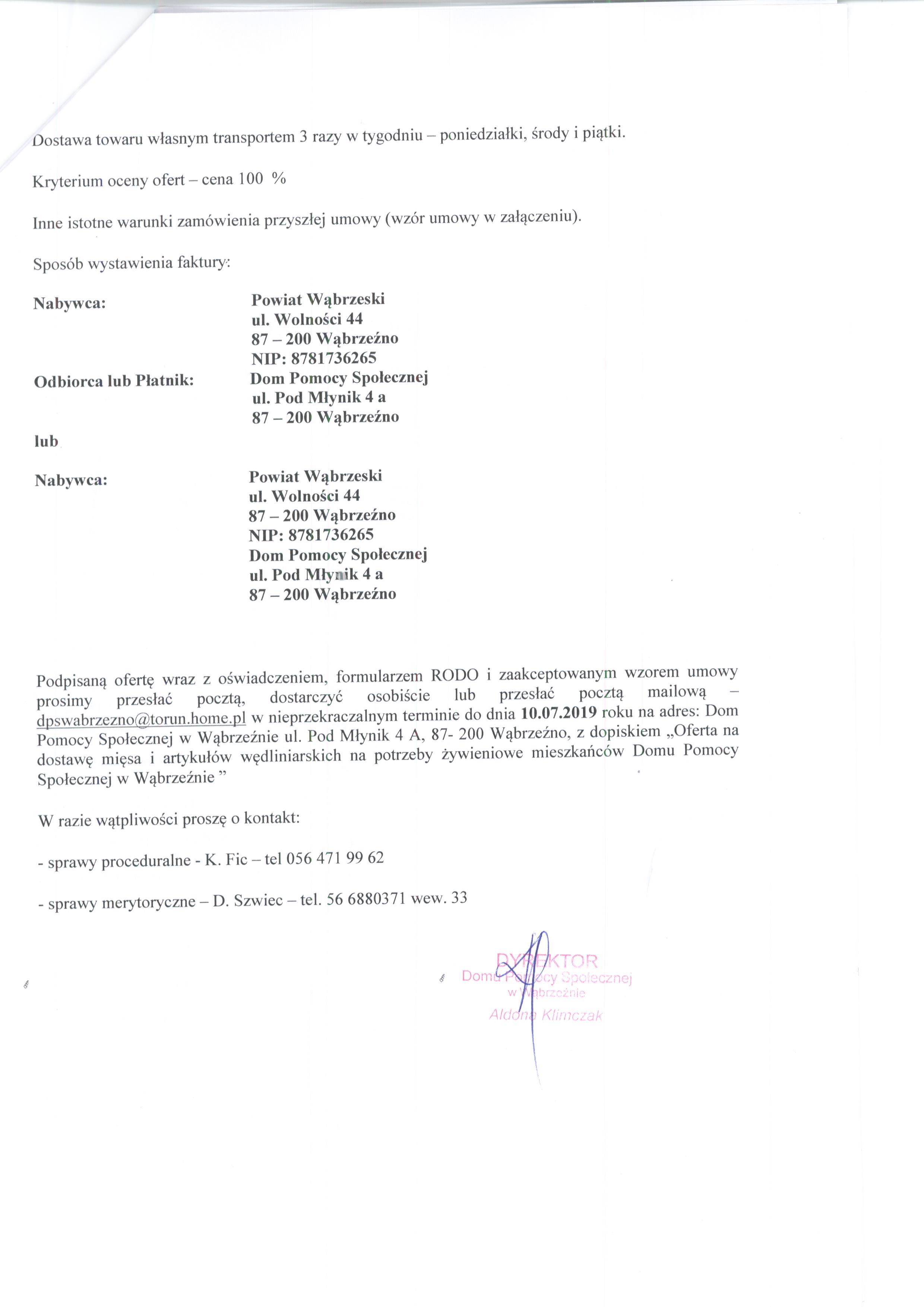 Podpisaną ofertę wraz z oświadczeniem, formularzem RODO i zaakceptowanym wzorem umowy prosimy przesłać pocztą, dostarczyć osobiście lub przesłać pocztą mailową – dpswabrzezno[at]torun[dot]home[dot]pl w nieprzekraczalnym terminie do dnia 10.07.2019 roku na adres: Dom Pomocy Społecznej w Wąbrzeźnie ul. Pod Młynik 4 A, 87- 200 Wąbrzeźno, z dopiskiem „Oferta na dostawę mięsa i artykułów wędliniarskich na potrzeby żywieniowe mieszkańców Domu Pomocy Społecznej w Wąbrzeźnie ”