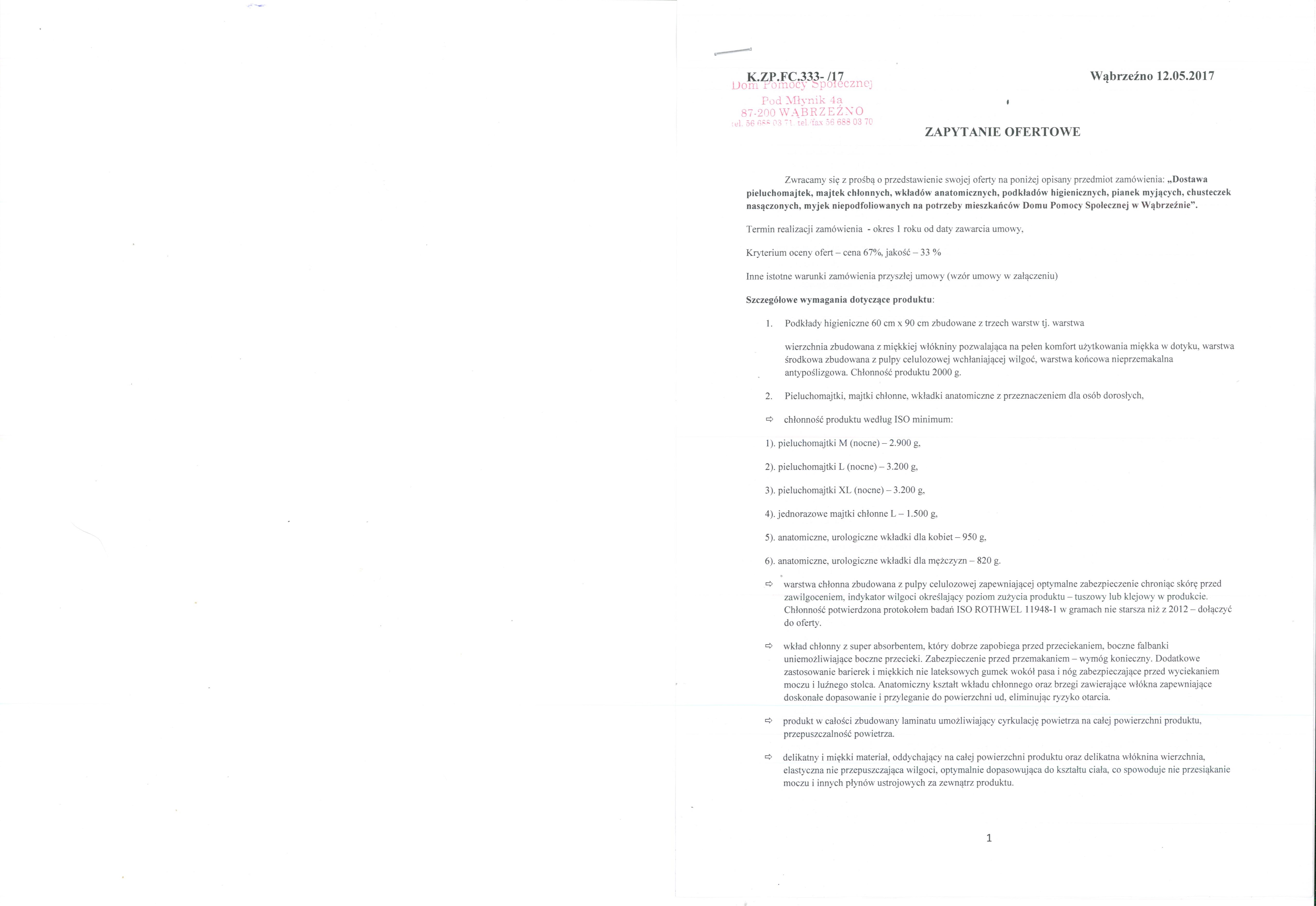 Zwracamy się z prośbą o przedstawienie swojej oferty na poniżej opisany przedmiot zamówienia: „Dostawa pieluchomajtek, majtek chłonnych, wkładów anatomicznych, podkładów higienicznych, pianek myjących, chusteczek nasączonych, myjek niepodfoliowanych na potrzeby mieszkańców Domu Pomocy Społecznej w Wąbrzeźnie”.