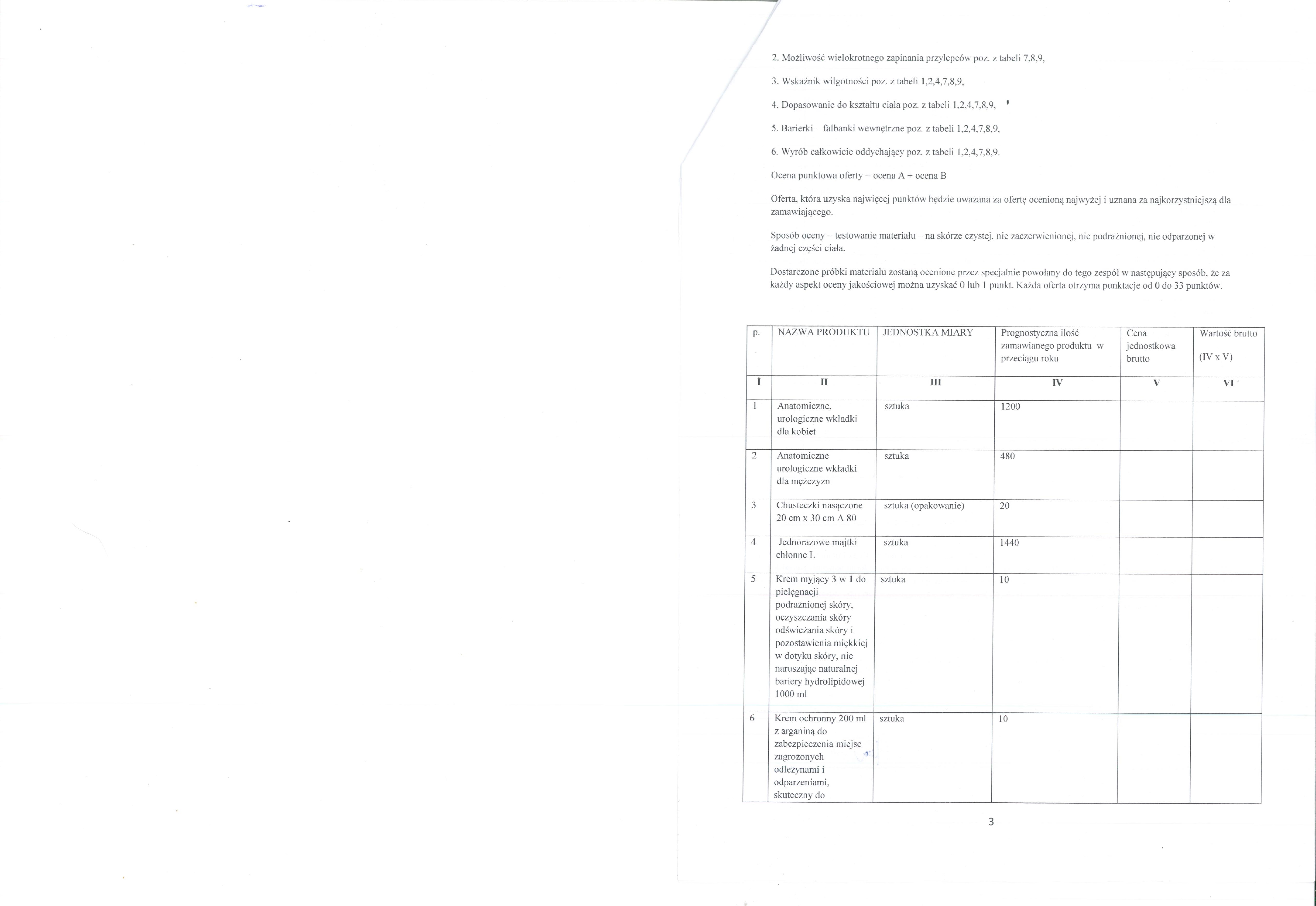 | p. | NAZWA PRODUKTU | JEDNOSTKA MIARY | Prognostyczna ilość zamawianego produktu w przeciągu roku | Cena jednostkowa brutto | Wartość brutto
