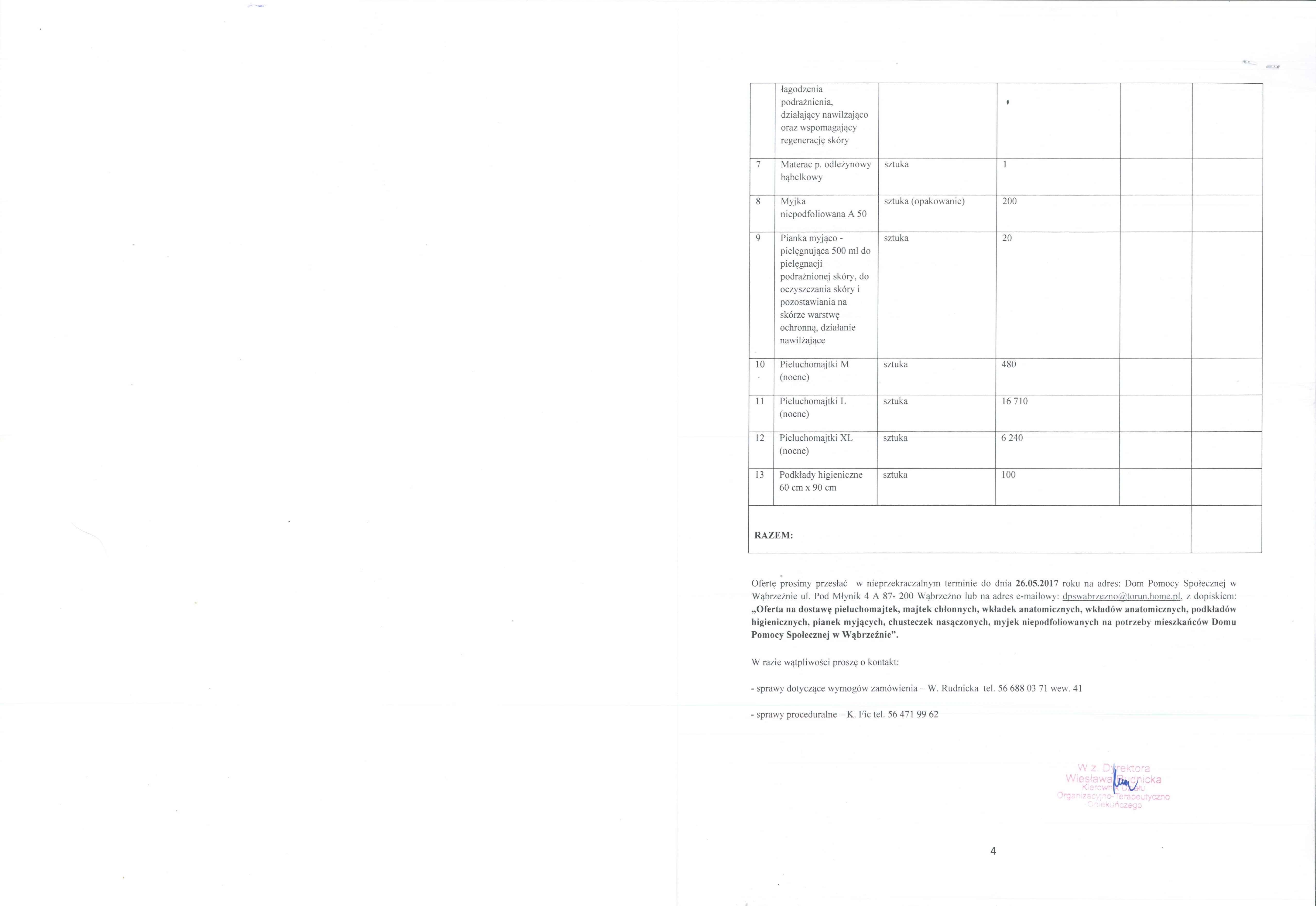 Ofertę prosimy przesłać w nieprzekraczalnym terminie do dnia 26.05.2017 roku na adres: Dom Pomocy Społecznej w Wąbrzeźnie ul. Pod Młynik 4 A 87- 200 Wąbrzeźno lub na adres e-mailowy: dpswabrzezno[at]torun[dot]home[dot]pl, z dopiskiem: „Oferta na dostawę pieluchomajtek, majtek chłonnych, wkładek anatomicznych, wkładów anatomicznych, podkładów higienicznych, pianek myjących, chusteczek nasączonych, myjek niepodfoliowanych na potrzeby mieszkańców Domu Pomocy Społecznej w Wąbrzeźnie”.