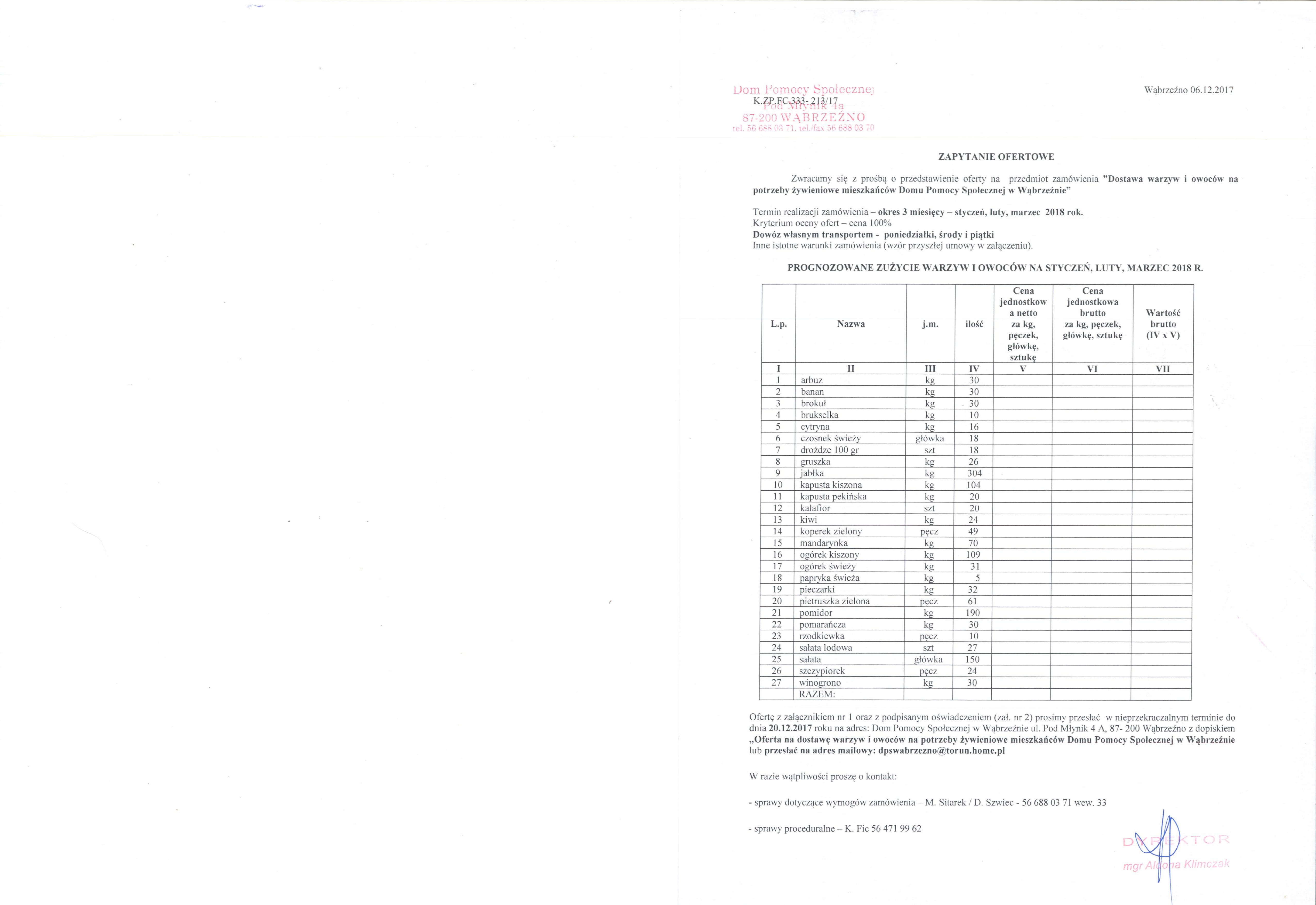 Ofertę z załącznikiem nr 1 oraz z podpisanym oświadczeniem (zał. nr 2) prosimy przesłać w nieprzekraczalnym terminie do dnia 20.12.2017 roku na adres: Dom Pomocy Społecznej w Wąbrzeźnie ul. Pod Młynik 4 A, 87- 200 Wąbrzeźno z dopiskiem „Oferta na dostawę warzyw i owoców na potrzeby żywieniowe mieszkańców Domu Pomocy Społecznej w Wąbrzeźnie lub przesłać na adres mailowy: dpswabrzezno[at]torun[dot]home[dot]pl