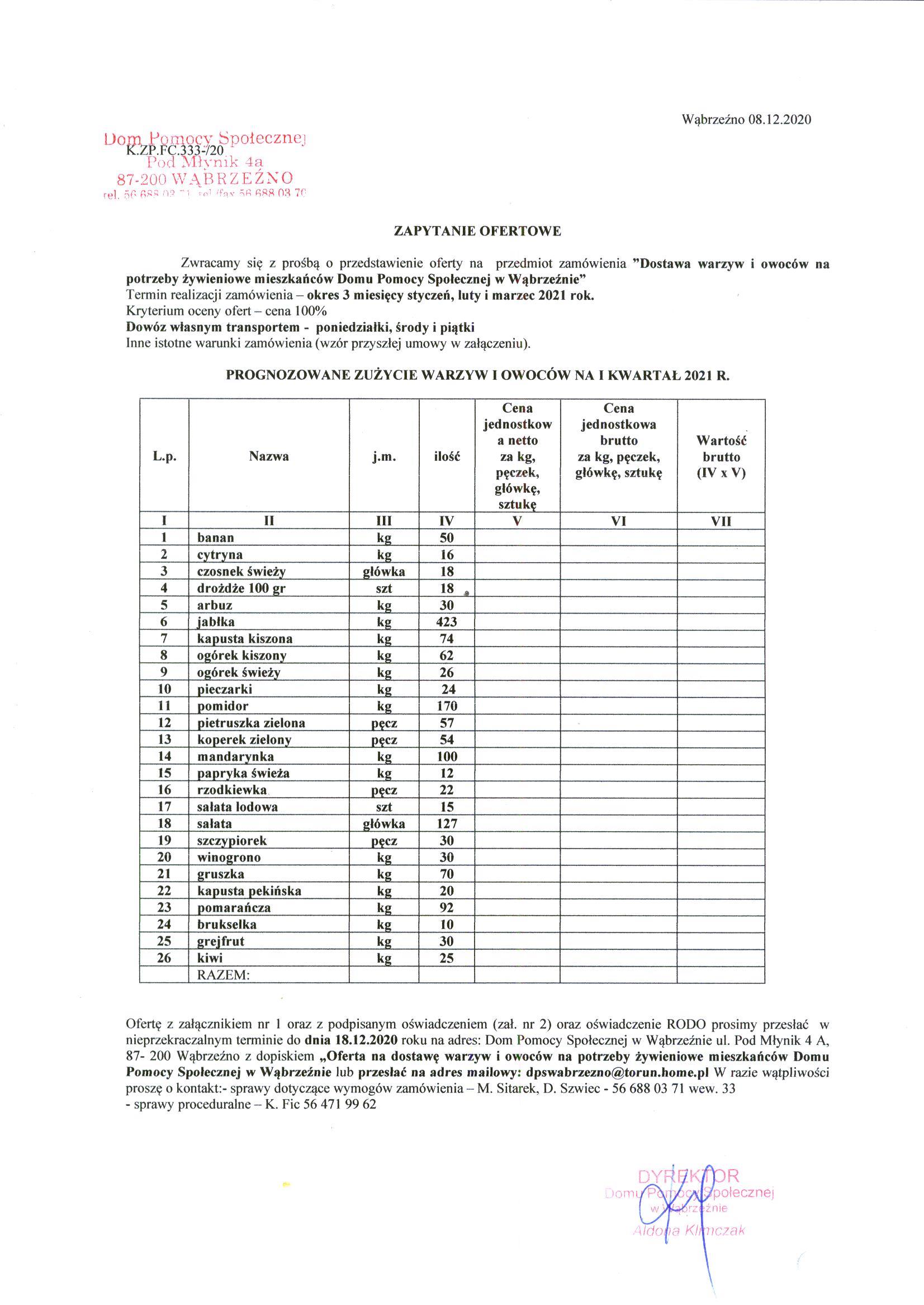 Zwracamy się z prośbą o przedstawienie oferty na przedmiot zamówienia ”Dostawa warzyw i owoców na potrzeby żywieniowe mieszkańców Domu Pomocy Społecznej w Wąbrzeźnie”