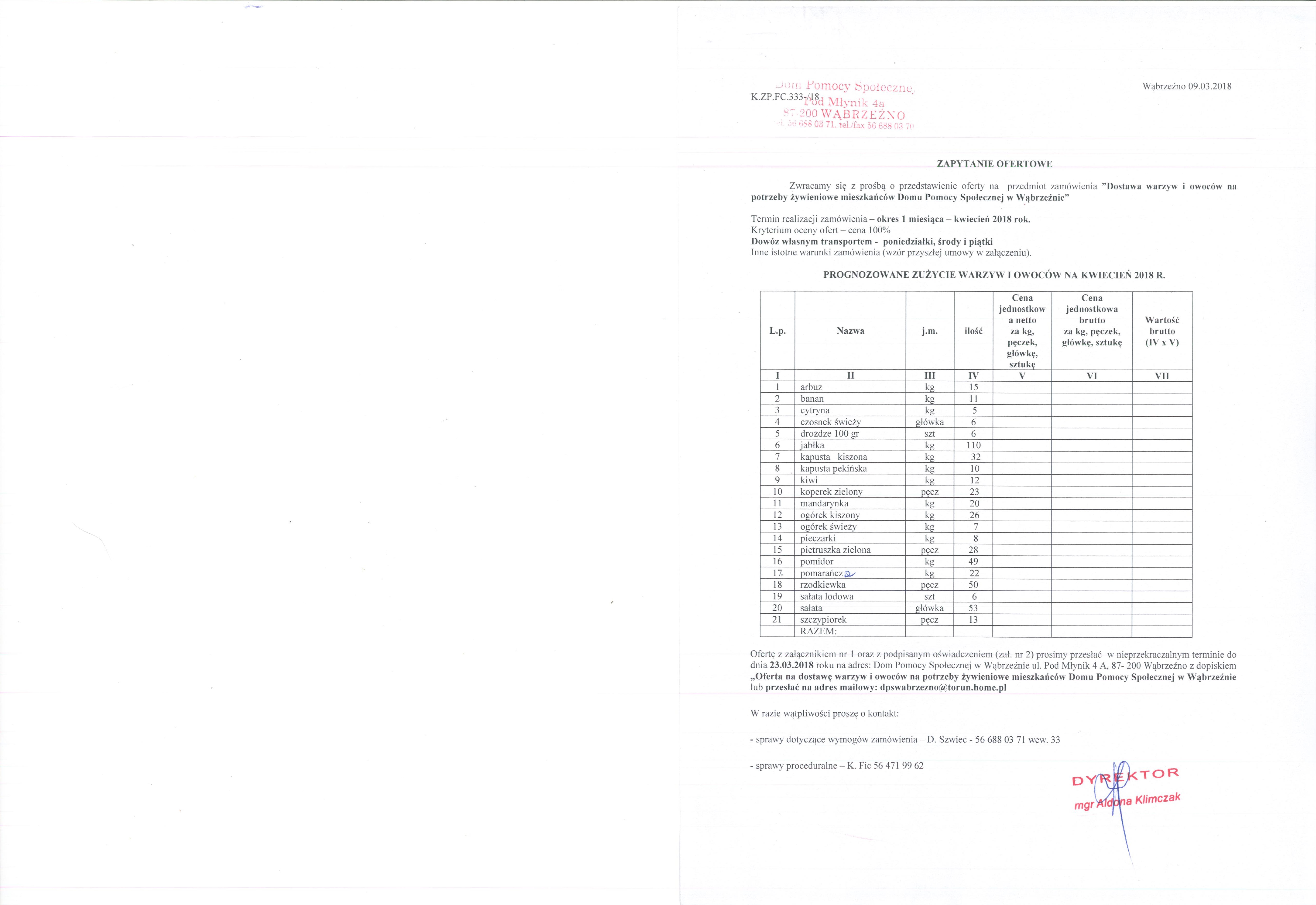 Ofertę z załącznikiem nr 1 oraz z podpisanym oświadczeniem (zał. nr 2) prosimy przesłać w nieprzekraczalnym terminie do dnia 23.03.2018 roku na adres: Dom Pomocy Społecznej w Wąbrzeźnie ul. Pod Młynik 4 A, 87- 200 Wąbrzeźno z dopiskiem „Oferta na dostawę warzyw i owoców na potrzeby żywieniowe mieszkańców Domu Pomocy Społecznej w Wąbrzeźnie lub przesłać na adres mailowy: dpswabrzezno[at]torun[dot]home[dot]pl