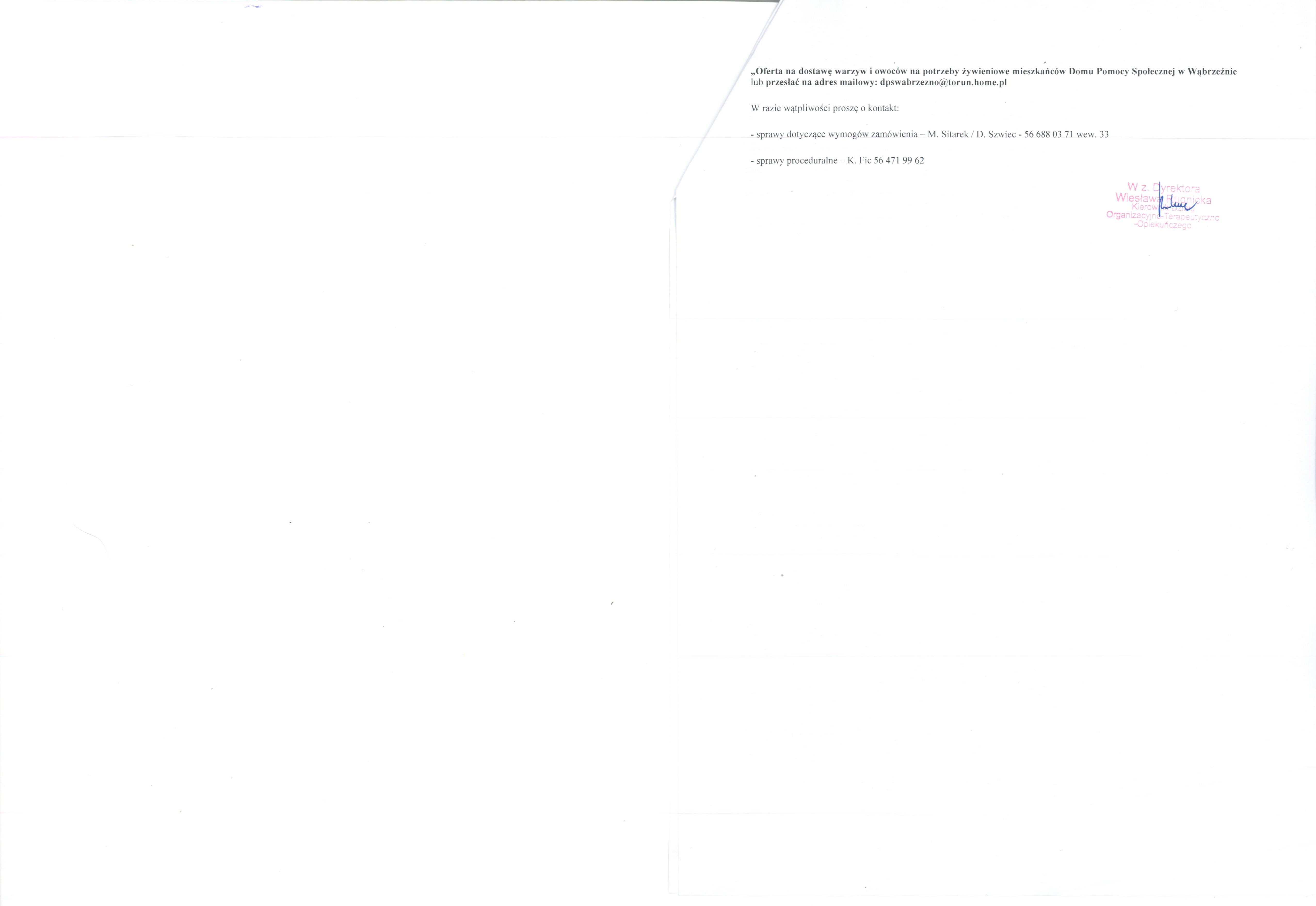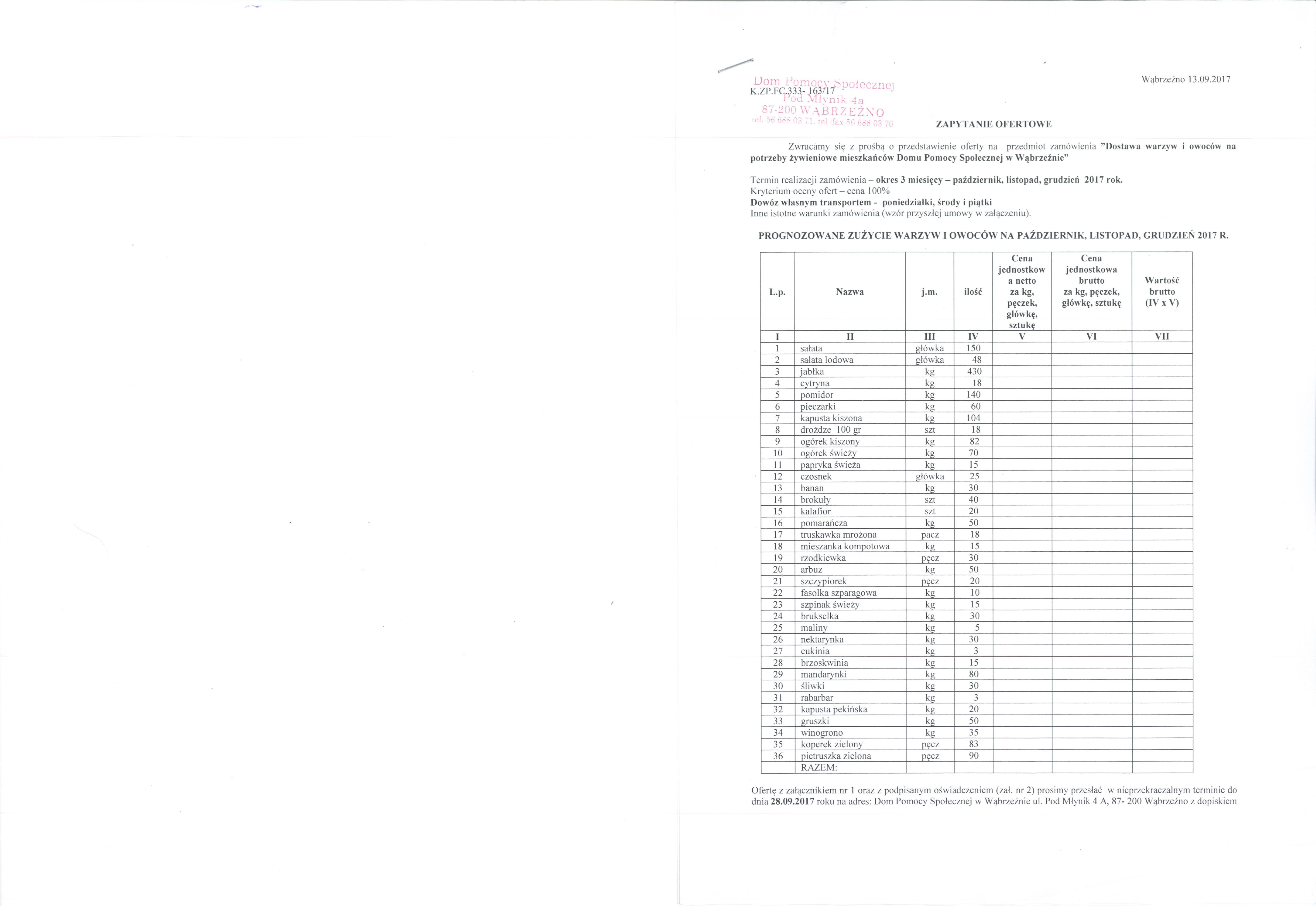Ofertę z załącznikiem nr 1 oraz z podpisanym oświadczeniem (zał. nr 2) prosimy przesłać w nieprzekraczalnym terminie do dnia 28.09.2017 roku na adres: Dom Pomocy Społecznej w Wąbrzeźnie ul. Pod Młynik 4 A, 87- 200 Wąbrzeźno z dopiskiem „Oferta na dostawę warzyw i owoców na potrzeby żywieniowe mieszkańców Domu Pomocy Społecznej w Wąbrzeźnie lub przesłać na adres mailowy: dpswabrzezno[at]torun[dot]home[dot]pl