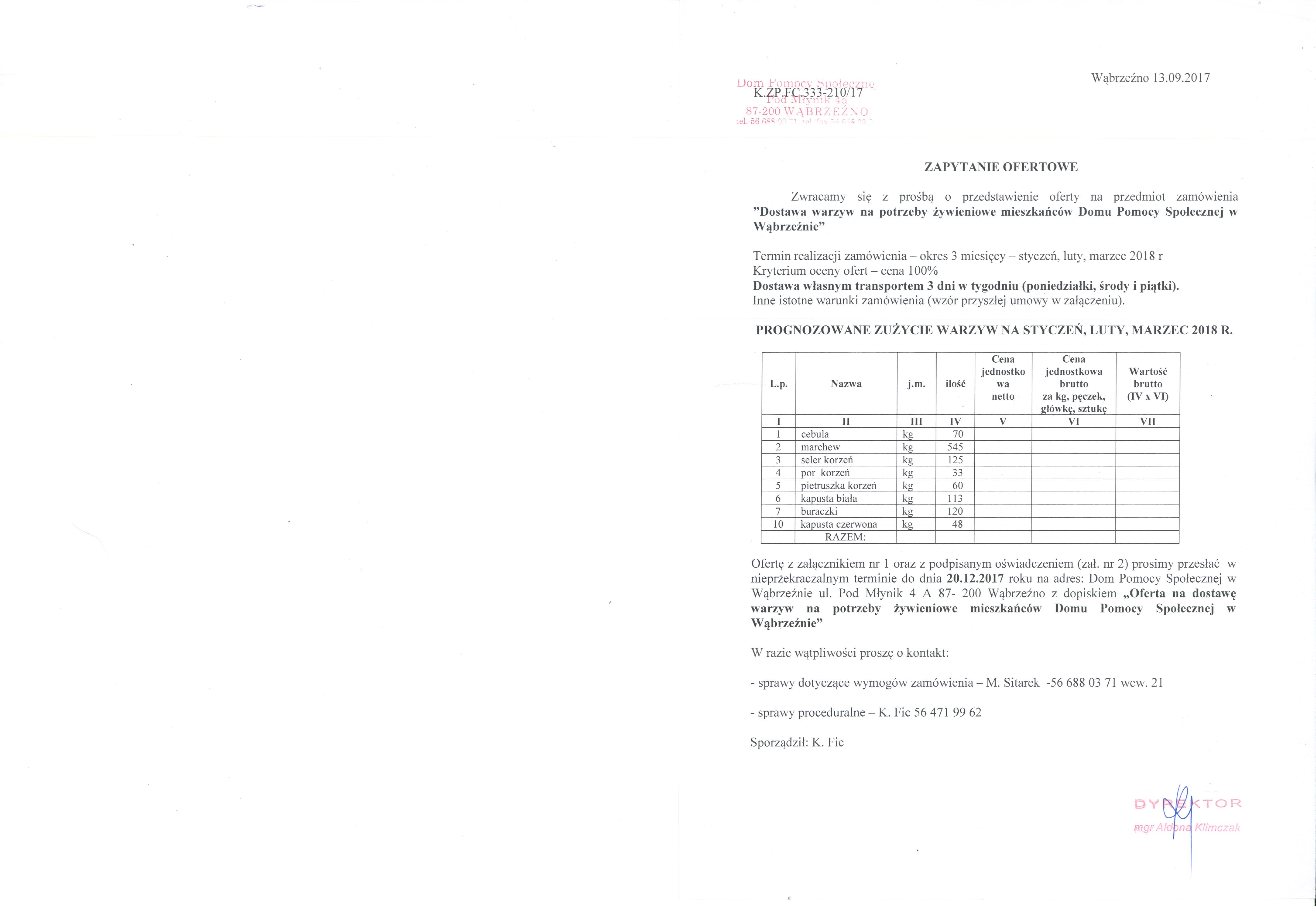 Ofertę z załącznikiem nr 1 oraz z podpisanym oświadczeniem (zał. nr 2) prosimy przesłać w nieprzekraczalnym terminie do dnia 20.12.2017 roku na adres: Dom Pomocy Społecznej w Wąbrzeźnie ul. Pod Młynik 4 A 87- 200 Wąbrzeźno z dopiskiem „Oferta na dostawę warzyw na potrzeby żywieniowe mieszkańców Domu Pomocy Społecznej w Wąbrzeźnie”