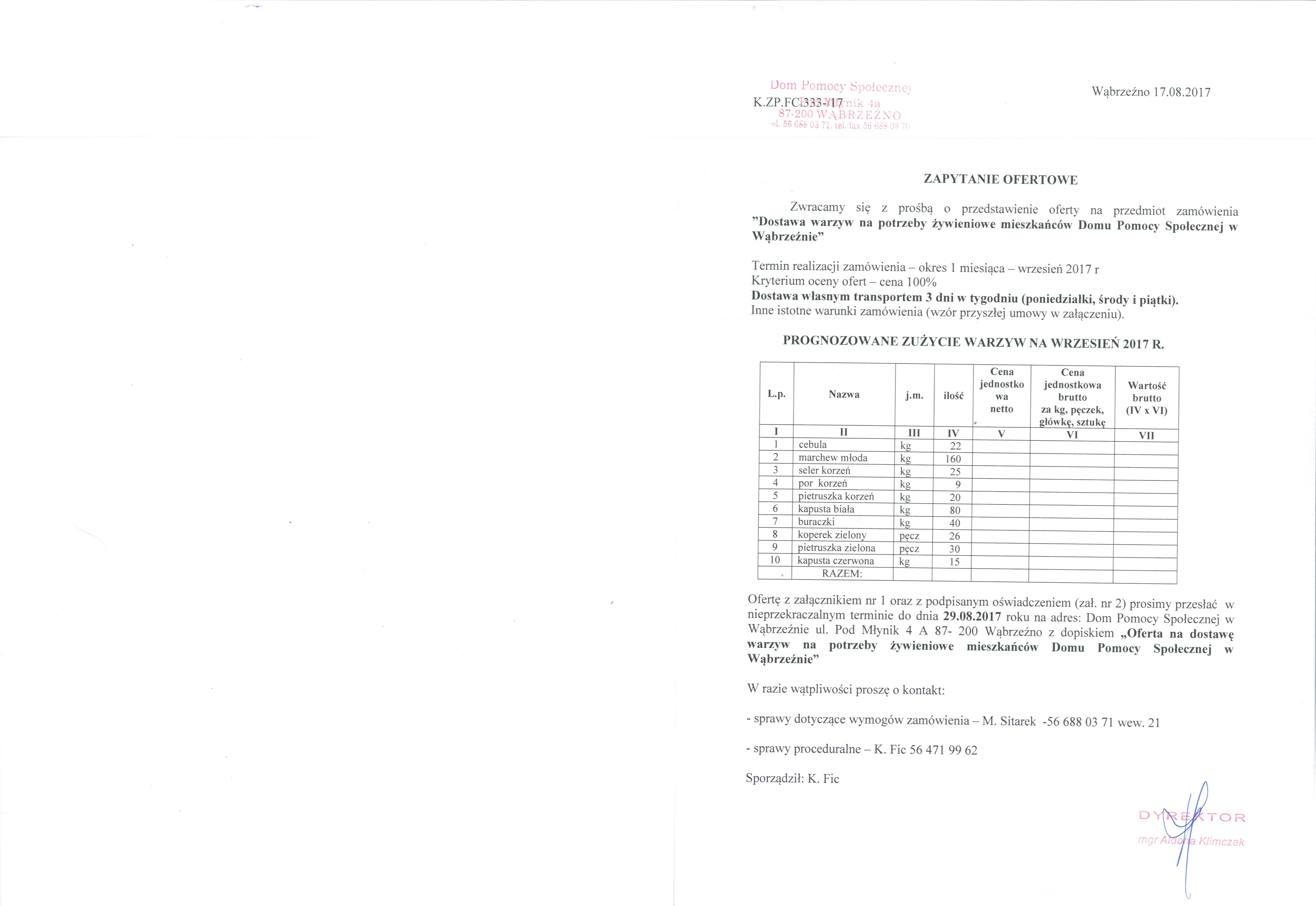Ofertę z załącznikiem nr 1 oraz z podpisanym oświadczeniem (zał. nr 2) prosimy przesłać w nieprzekraczalnym terminie do dnia 29.08.2017 roku na adres: Dom Pomocy Społecznej w Wąbrzeźnie ul. Pod Młynik 4 A 87- 200 Wąbrzeźno z dopiskiem „Oferta na dostawę warzyw na potrzeby żywieniowe mieszkańców Domu Pomocy Społecznej w Wąbrzeźnie”