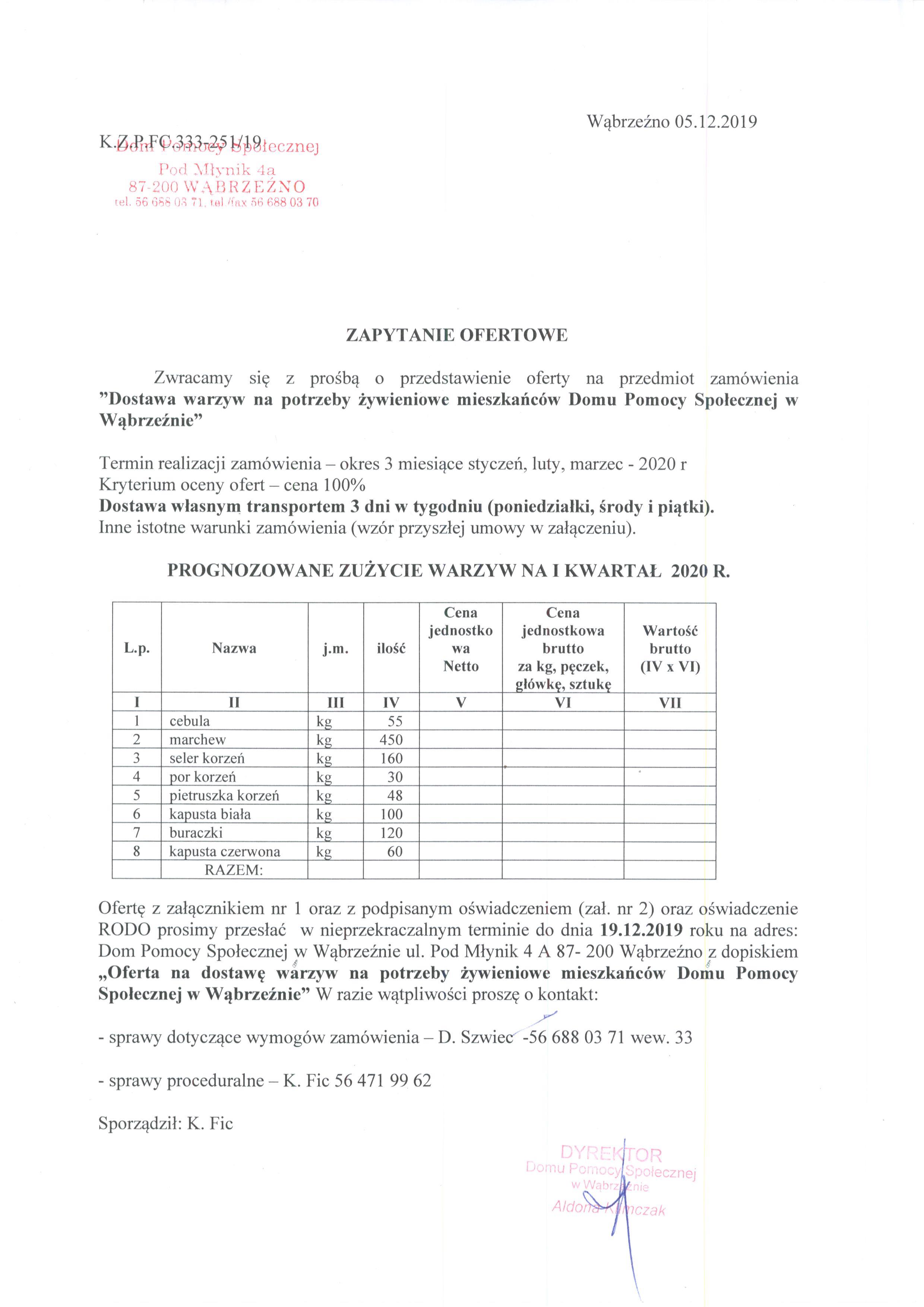 Ofertę z załącznikiem nr 1 oraz z podpisanym oświadczeniem (zał. nr 2) oraz oświadczenie RODO prosimy przesłać w nieprzekraczalnym terminie do dnia 19.12.2019 roku na adres: Dom Pomocy Społecznej w Wąbrzeźnie ul. Pod Młynik 4 A 87- 200 Wąbrzeźno z dopiskiem „Oferta na dostawę warzyw na potrzeby żywieniowe mieszkańców Domu Pomocy Społecznej w Wąbrzeźnie” W razie wątpliwości proszę o kontakt: