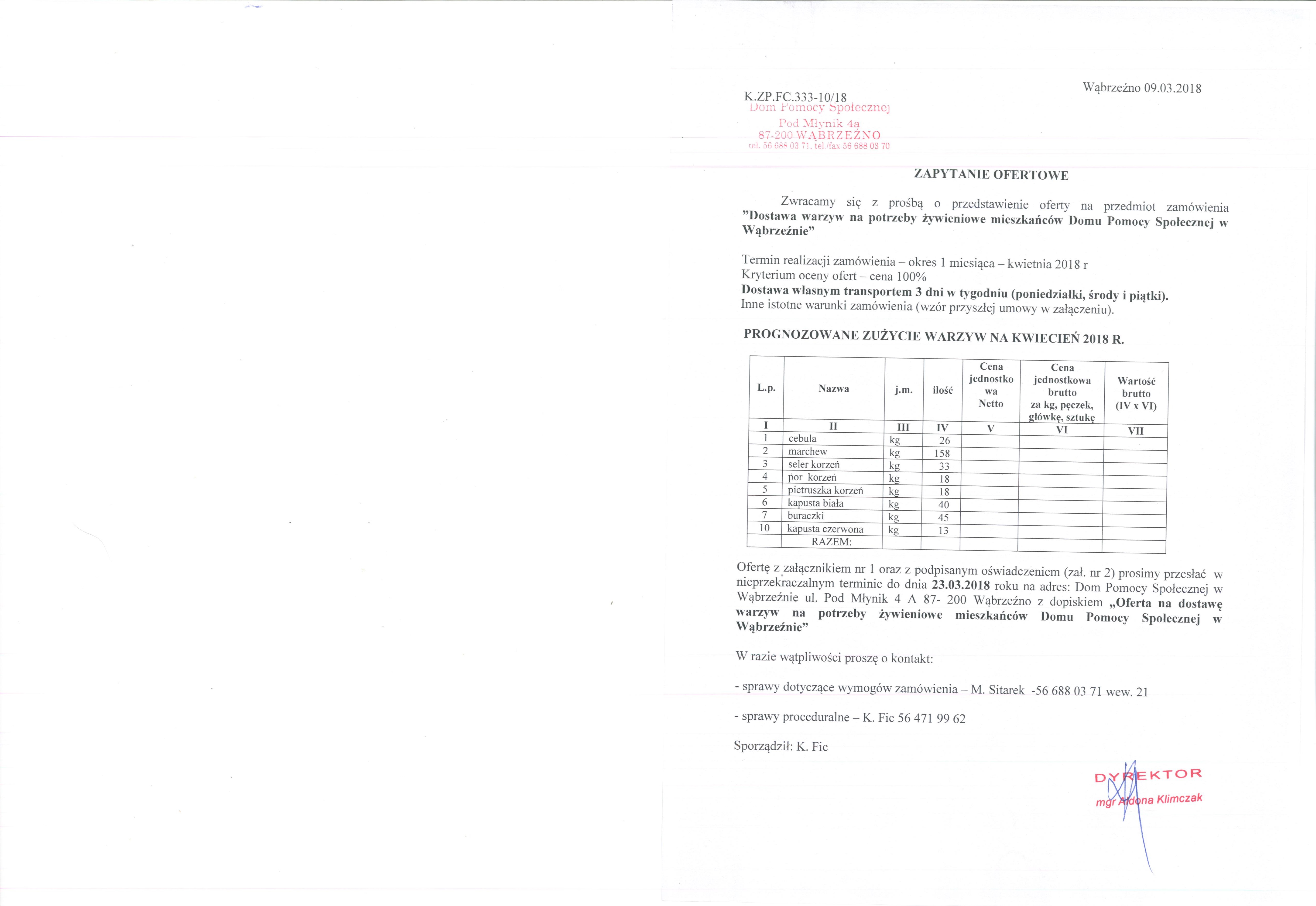 Zwracamy się z prośbą o przedstawienie oferty na przedmiot zamówienia ”Dostawa warzyw na potrzeby żywieniowe mieszkańców Domu Pomocy Społecznej w Wąbrzeźnie”