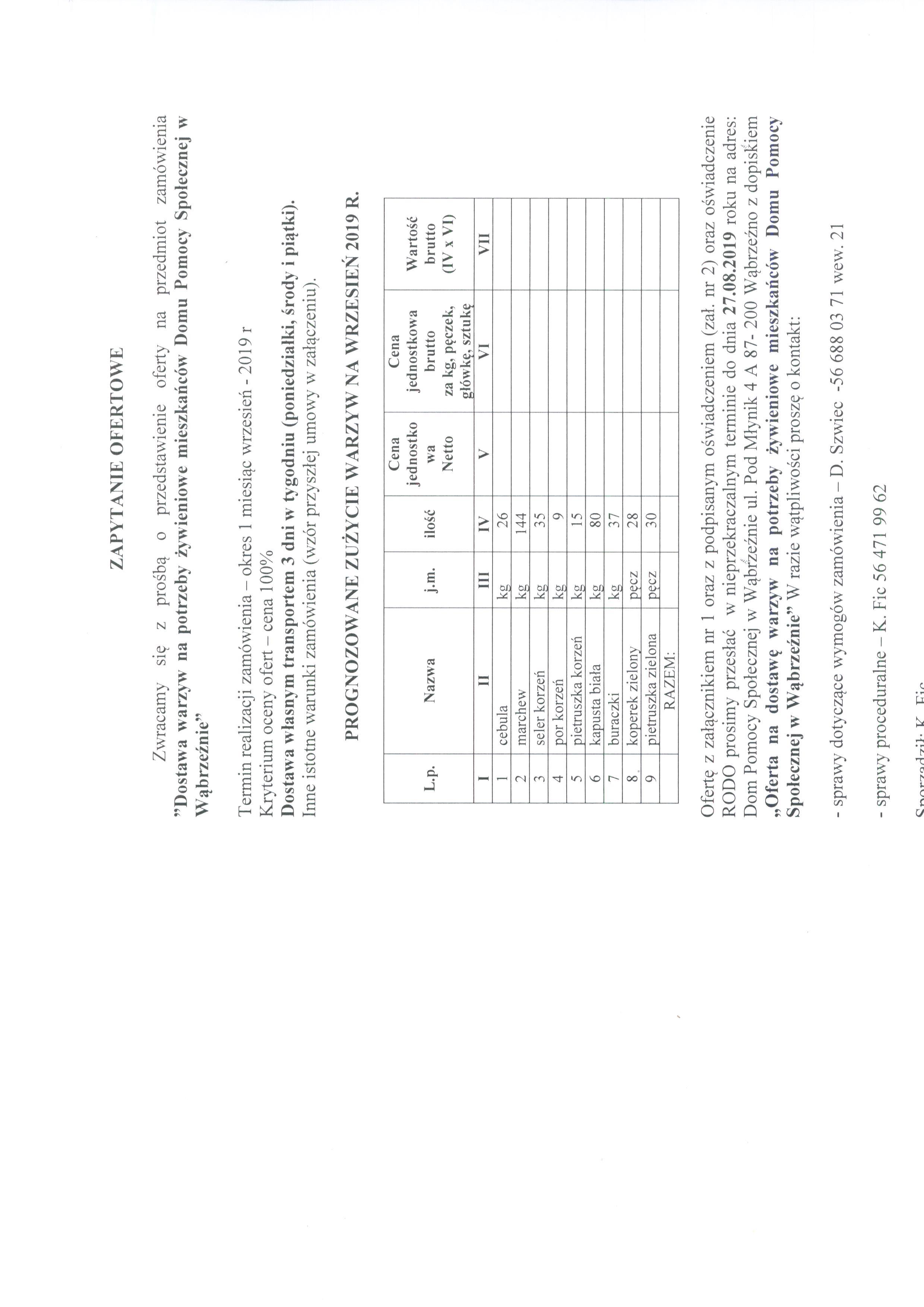 Zwracamy się z prośbą o przedstawienie oferty na przedmiot zamówienia ”Dostawa warzyw na potrzeby żywieniowe mieszkańców Domu Pomocy Społecznej w Wąbrzeźnie”