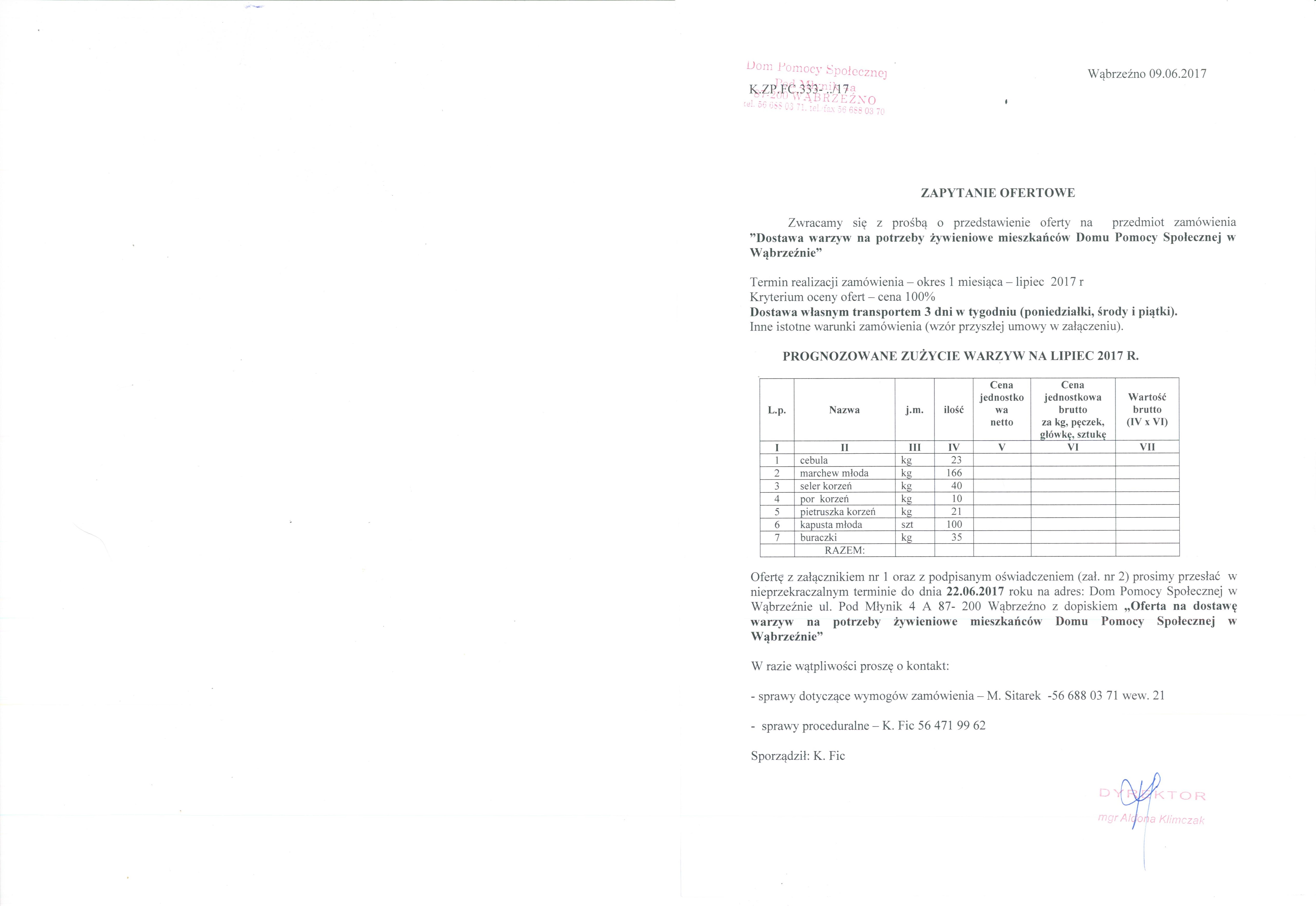 Ofertę z załącznikiem nr 1 oraz z podpisanym oświadczeniem (zał. nr 2) prosimy przesłać w nieprzekraczalnym terminie do dnia 22.06.2017 roku na adres: Dom Pomocy Społecznej w Wąbrzeźnie ul. Pod Młynik 4 A 87- 200 Wąbrzeźno z dopiskiem „Oferta na dostawę warzyw na potrzeby żywieniowe mieszkańców Domu Pomocy Społecznej w Wąbrzeźnie”