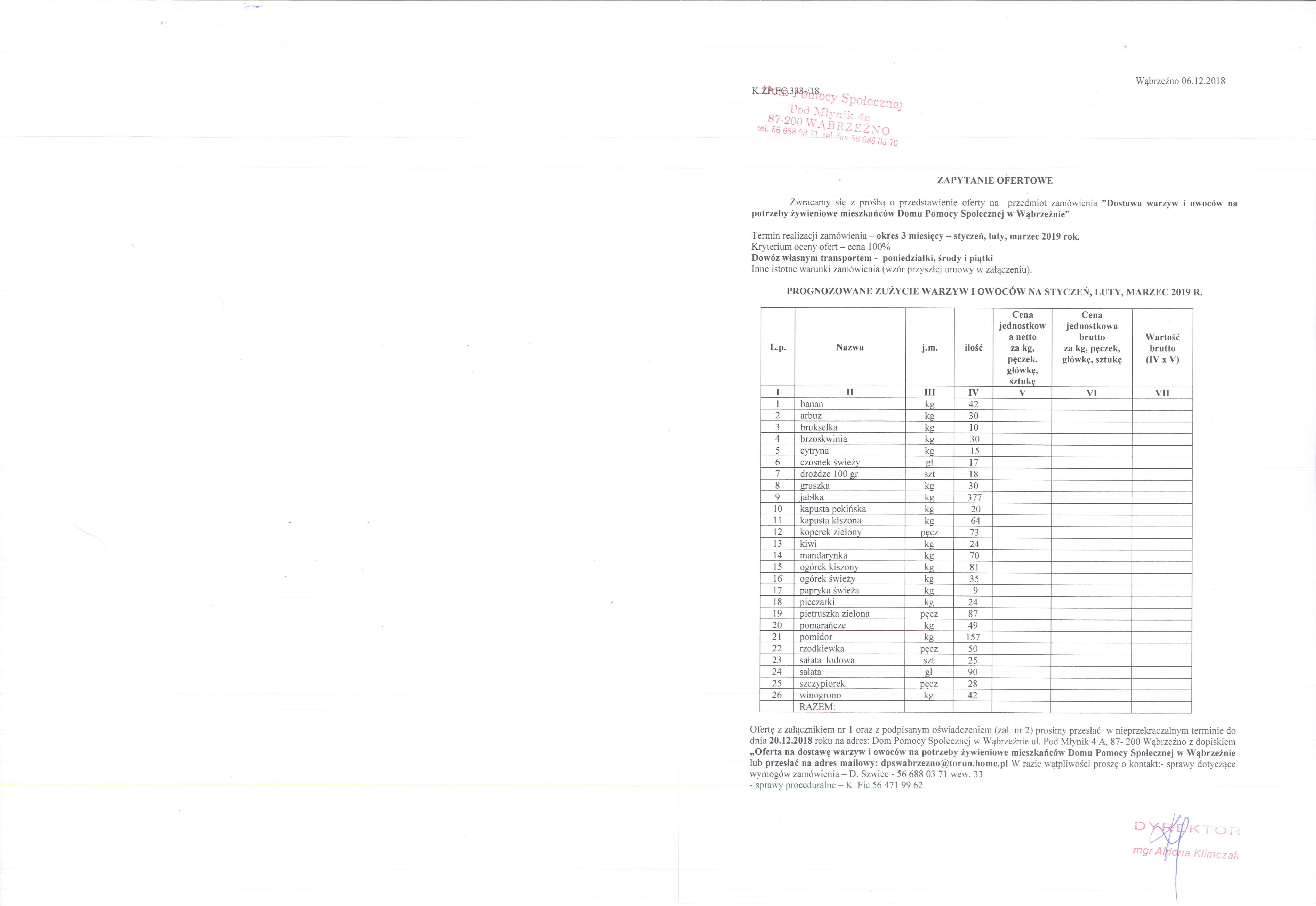 Ofertę z załącznikiem nr 1 oraz z podpisanym oświadczeniem (zał. nr 2) prosimy przesłać w nieprzekraczalnym terminie do dnia 20.12.2018 roku na adres: Dom Pomocy Społecznej w Wąbrzeźnie ul. Pod Młynik 4 A 87- 200 Wąbrzeźno z dopiskiem „Oferta na dostawę ziemniaków na potrzeby żywieniowe mieszkańców Domu Pomocy Społecznej w Wąbrzeźnie