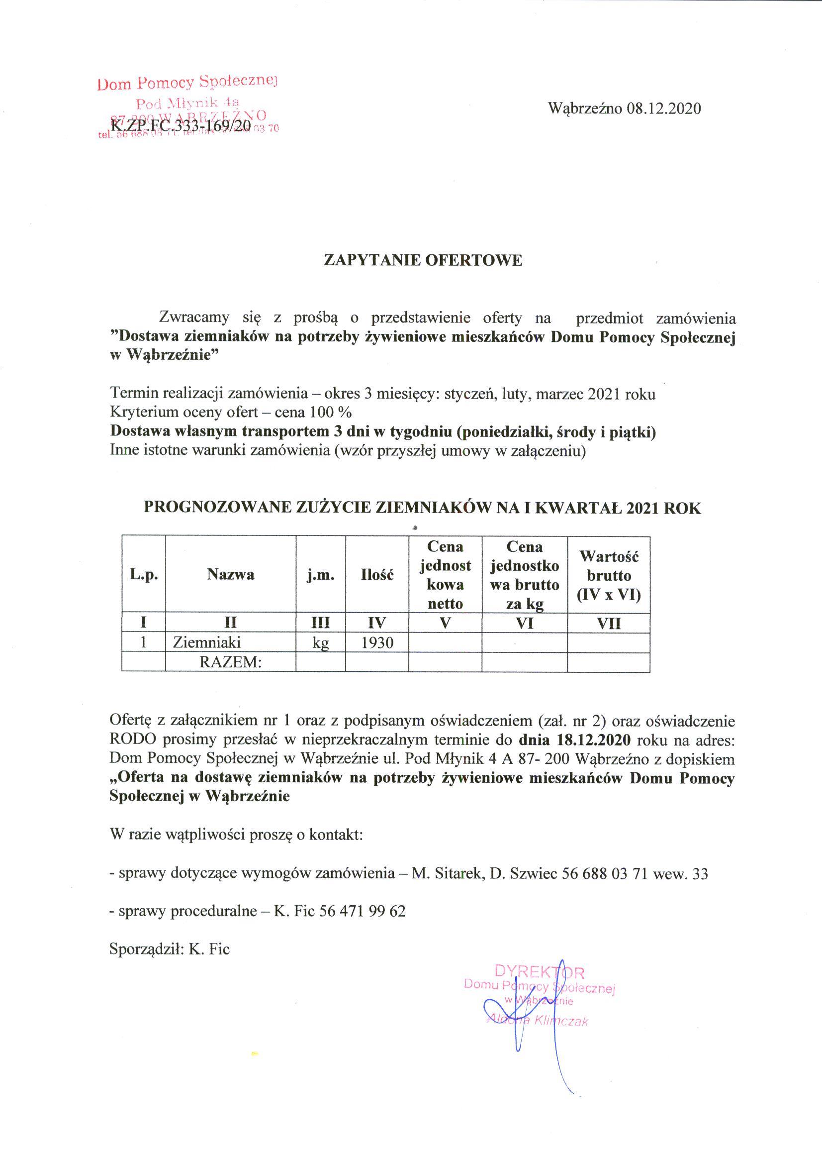 Ofertę z załącznikiem nr 1 oraz z podpisanym oświadczeniem (zał. nr 2) oraz oświadczenie RODO prosimy przesłać w nieprzekraczalnym terminie do dnia 18.12.2020 roku na adres: Dom Pomocy Społecznej w Wąbrzeźnie ul. Pod Młynik 4 A 87- 200 Wąbrzeźno z dopiskiem „Oferta na dostawę ziemniaków na potrzeby żywieniowe mieszkańców Domu Pomocy Społecznej w Wąbrzeźnie