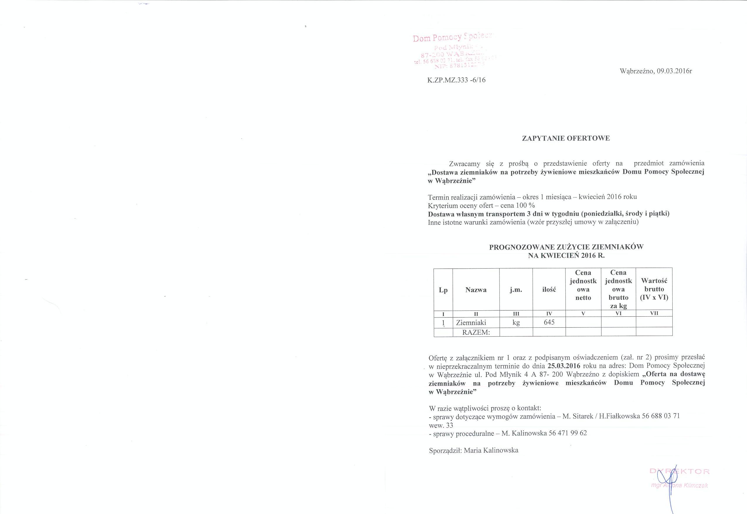 Ofertę z załącznikiem nr 1 oraz z podpisanym oświadczeniem (zał. nr 2) prosimy przesłać w nieprzekraczalnym terminie do dnia 25.03.2016 roku na adres: Dom Pomocy Społecznej w Wąbrzeźnie ul. Pod Młynik 4 A 87- 200 Wąbrzeźno
