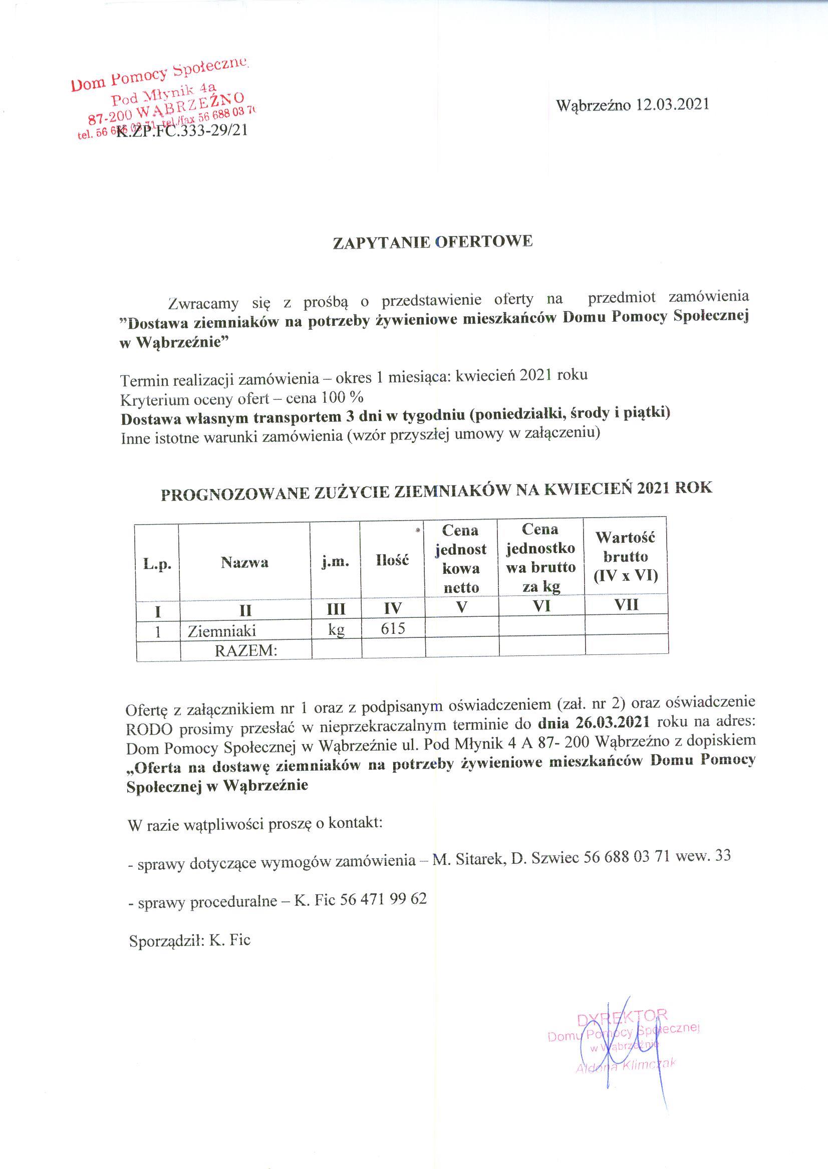 Ofertę z załącznikiem nr 1 oraz z podpisanym oświadczeniem (zał. nr 2) oraz oświadczenie RODO prosimy przesłać w nieprzekraczalnym terminie do dnia 26.03.2021 roku na adres: Dom Pomocy Społecznej w Wąbrzeźnie ul. Pod Młynik 4 A 87- 200 Wąbrzeźno z dopiskiem „Oferta na dostawę ziemniaków na potrzeby żywieniowe mieszkańców Domu Pomocy Społecznej w Wąbrzeźnie