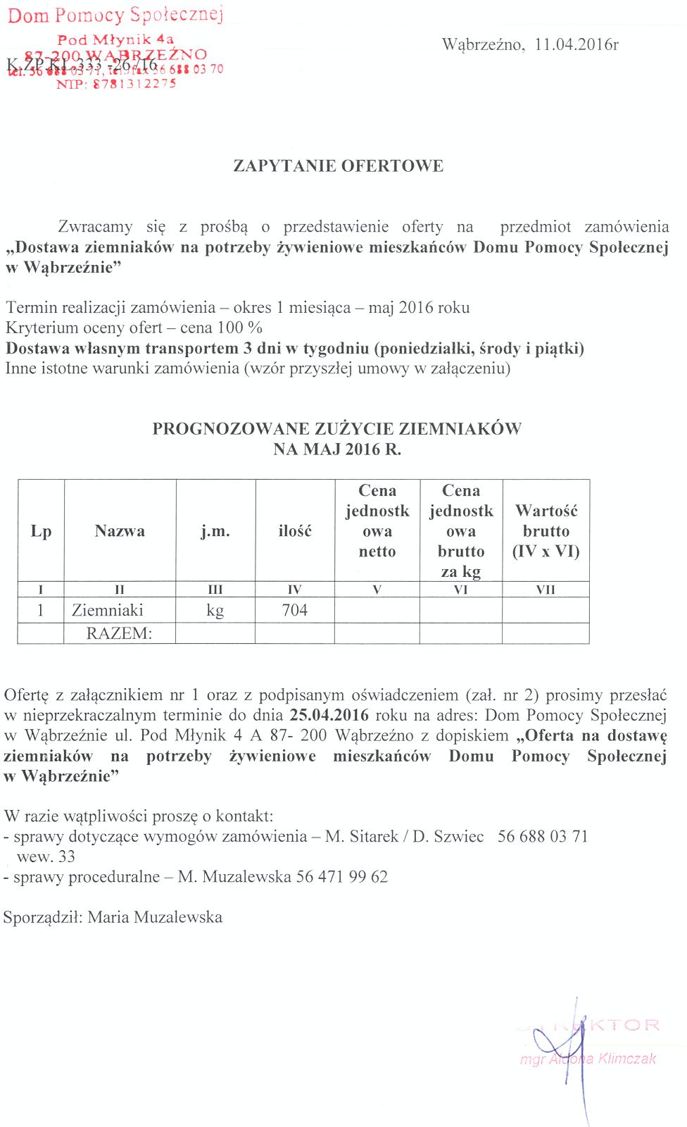 Ofertę z załącznikiem nr 1 oraz z podpisanym oświadczeniem (zał. nr 2) prosimy przesłać w nieprzekraczalnym terminie do dnia 25.04.2016 roku na adres: Dom Pomocy Społecznej w Wąbrzeźnie ul. Pod Młynik 4 A 87- 200 Wąbrzeźno z dopiskiem „Oferta na dostawę ziemniaków na potrzeby żywieniowe mieszkańców Domu Pomocy Społecznej w Wąbrzeźnie”