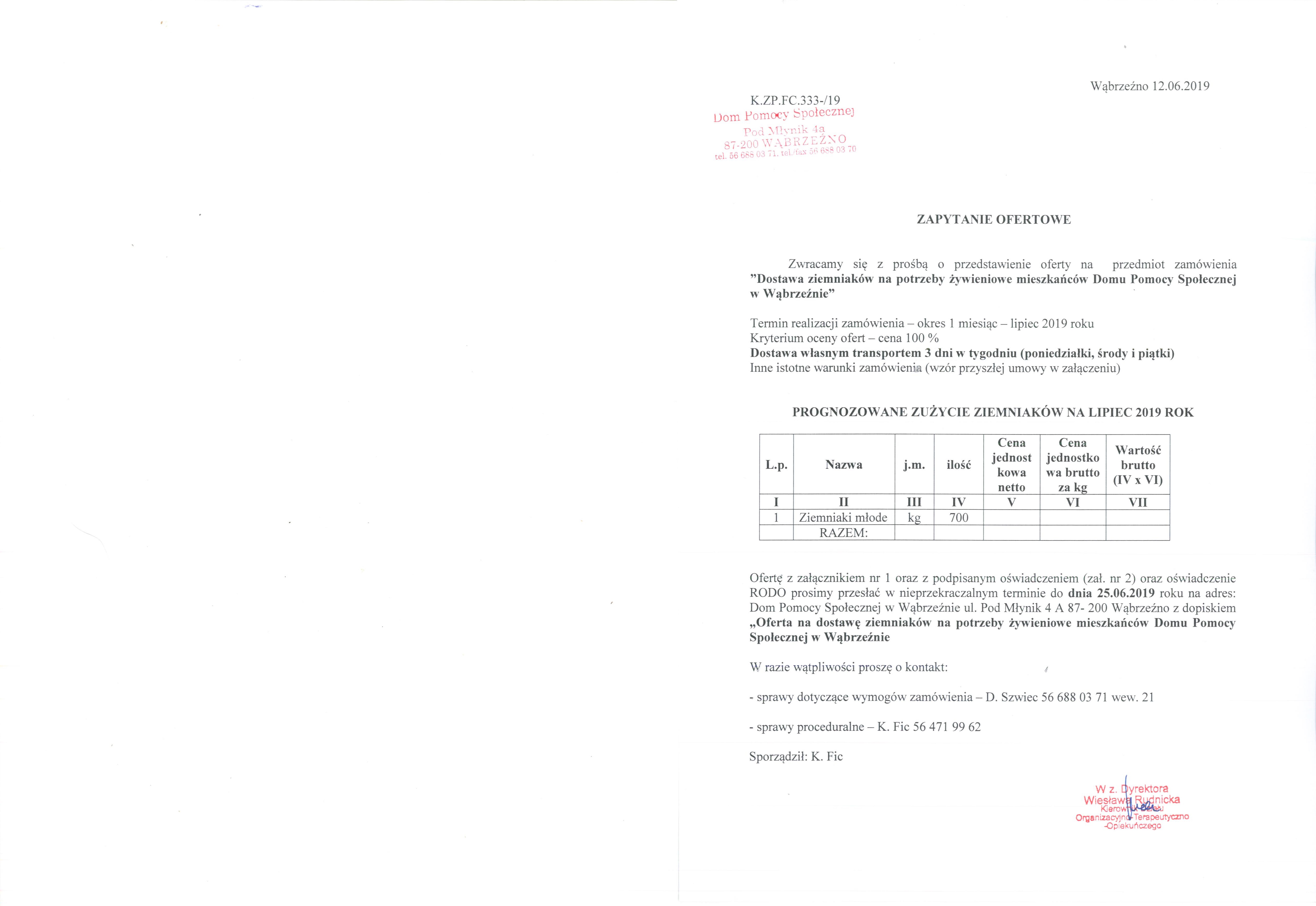 Ofertę z załącznikiem nr 1 oraz z podpisanym oświadczeniem (zał. nr 2) oraz oświadczenie RODO prosimy przesłać w nieprzekraczalnym terminie do dnia 25.06.2019 roku na adres: Dom Pomocy Społecznej w Wąbrzeźnie ul. Pod Młynik 4 A 87- 200 Wąbrzeźno z dopiskiem „Oferta na dostawę ziemniaków na potrzeby żywieniowe mieszkańców Domu Pomocy Społecznej w Wąbrzeźnie