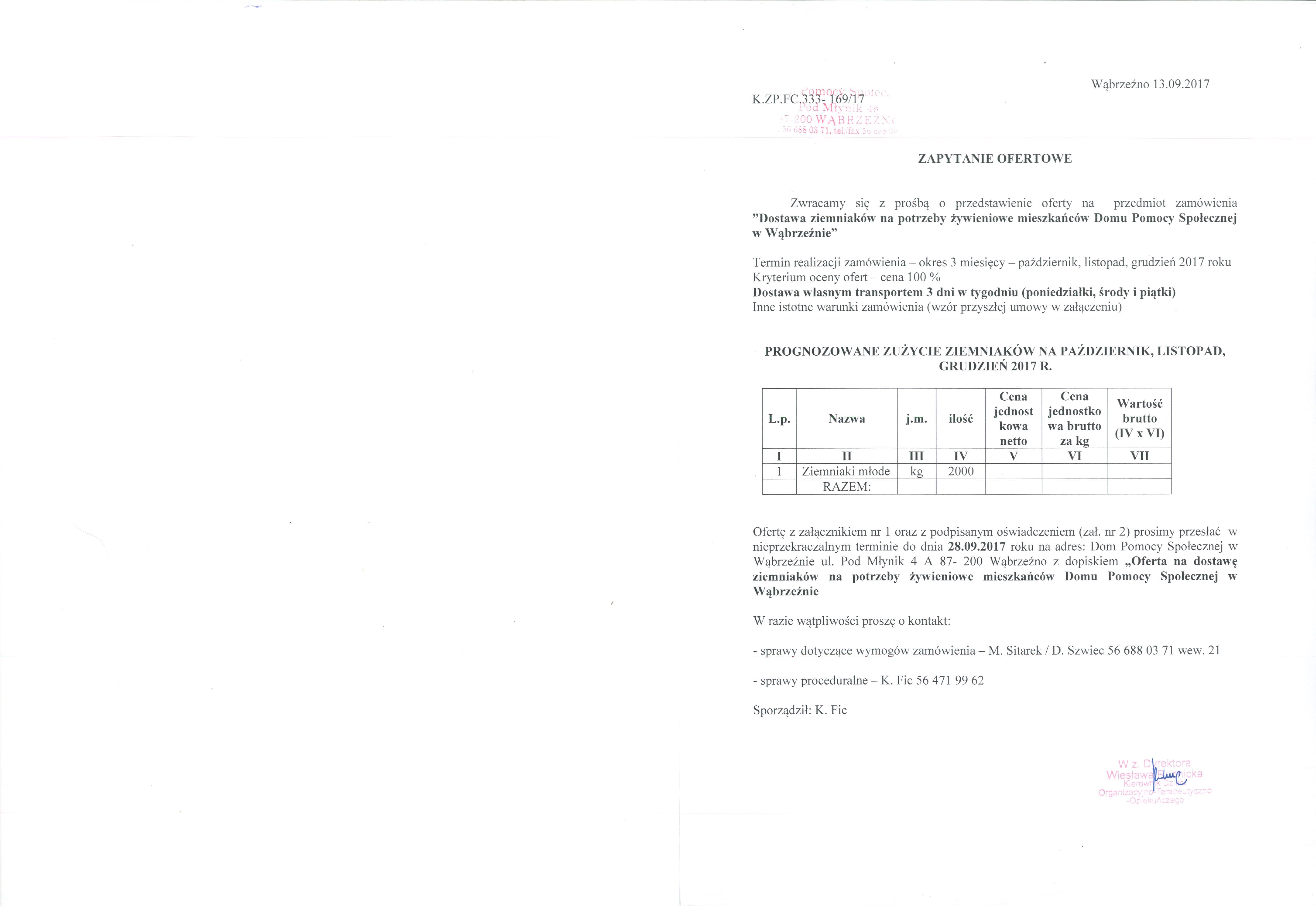 Ofertę z załącznikiem nr 1 oraz z podpisanym oświadczeniem (zał. nr 2) prosimy przesłać w nieprzekraczalnym terminie do dnia 28.09.2017 roku na adres: Dom Pomocy Społecznej w Wąbrzeźnie ul. Pod Młynik 4 A 87- 200 Wąbrzeźno z dopiskiem „Oferta na dostawę ziemniaków na potrzeby żywieniowe mieszkańców Domu Pomocy Społecznej w Wąbrzeźnie