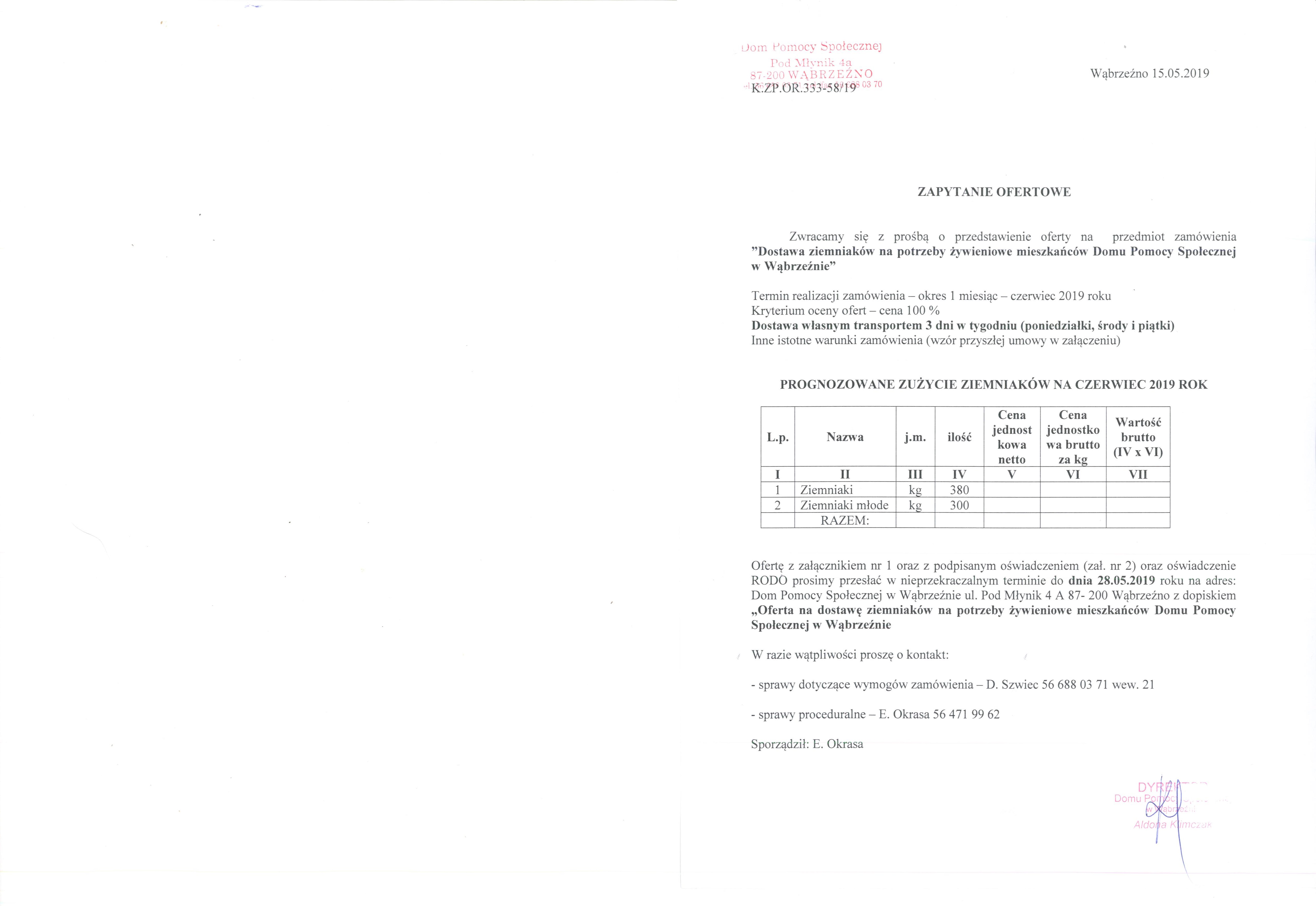 Ofertę z załącznikiem nr 1 oraz z podpisanym oświadczeniem (zał. nr 2) oraz oświadczenie RODO prosimy przesłać w nieprzekraczalnym terminie do dnia 28.05.2019 roku na adres: Dom Pomocy Społecznej w Wąbrzeźnie ul. Pod Młynik 4 A 87- 200 Wąbrzeźno z dopiskiem „Oferta na dostawę ziemniaków na potrzeby żywieniowe mieszkańców Domu Pomocy Społecznej w Wąbrzeźnie
