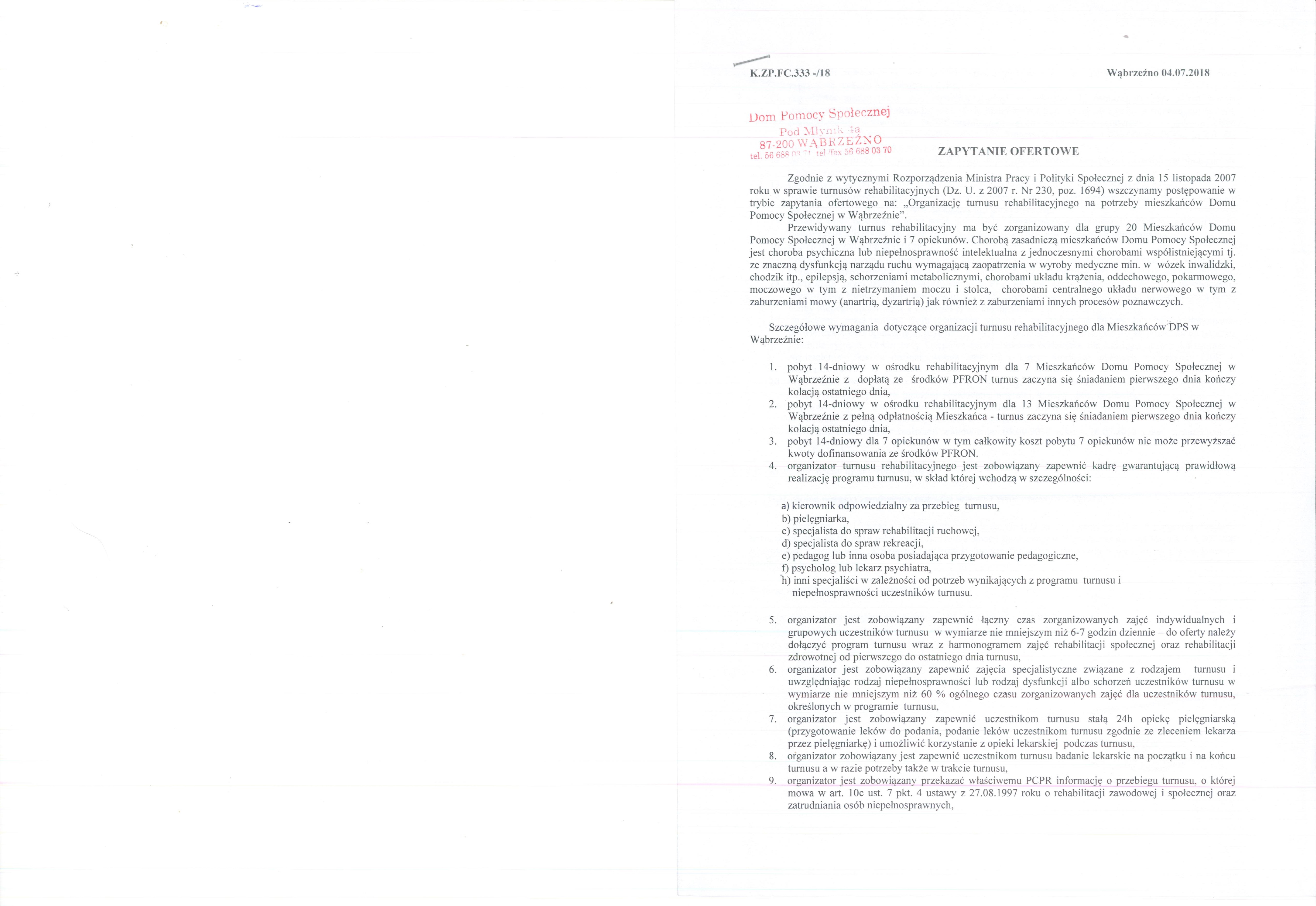 Zgodnie z wytycznymi Rozporządzenia Ministra Pracy i Polityki Społecznej z dnia 15 listopada 2007 roku w sprawie turnusów rehabilitacyjnych (Dz. U. z 2007 r. Nr 230, poz. 1694) wszczynamy postępowanie w trybie zapytania ofertowego na: „Organizację turnusu rehabilitacyjnego na potrzeby mieszkańców Domu Pomocy Społecznej w Wąbrzeźnie”.