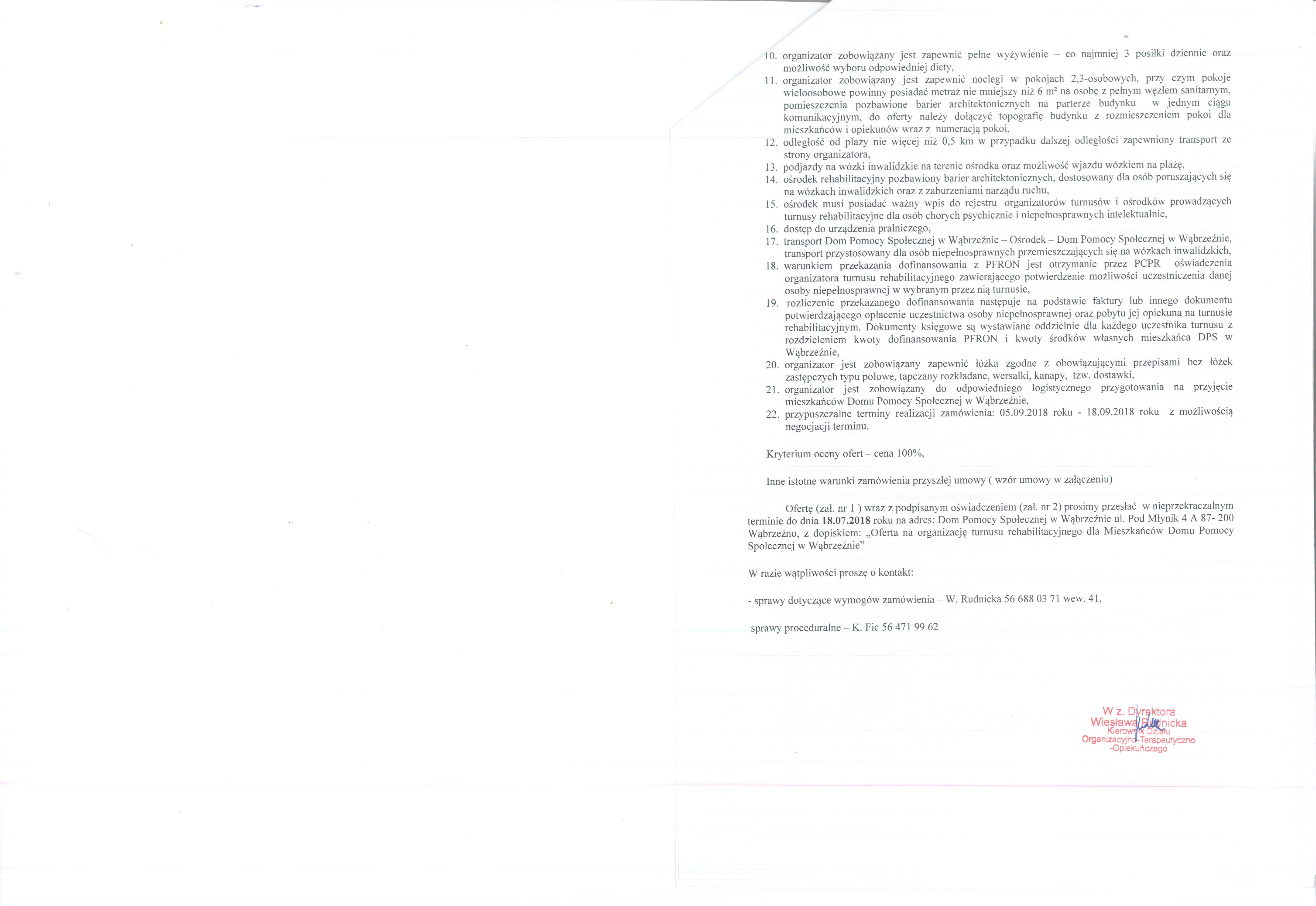 Ofertę (zał. nr 1 ) wraz z podpisanym oświadczeniem (zał. nr 2) prosimy przesłać w nieprzekraczalnym terminie do dnia 18.07.2018 roku na adres: Dom Pomocy Społecznej w Wąbrzeźnie ul. Pod Młynik 4 A 87- 200 Wąbrzeźno, z dopiskiem: „Oferta na organizację turnusu rehabilitacyjnego dla Mieszkańców Domu Pomocy Społecznej w Wąbrzeźnie”