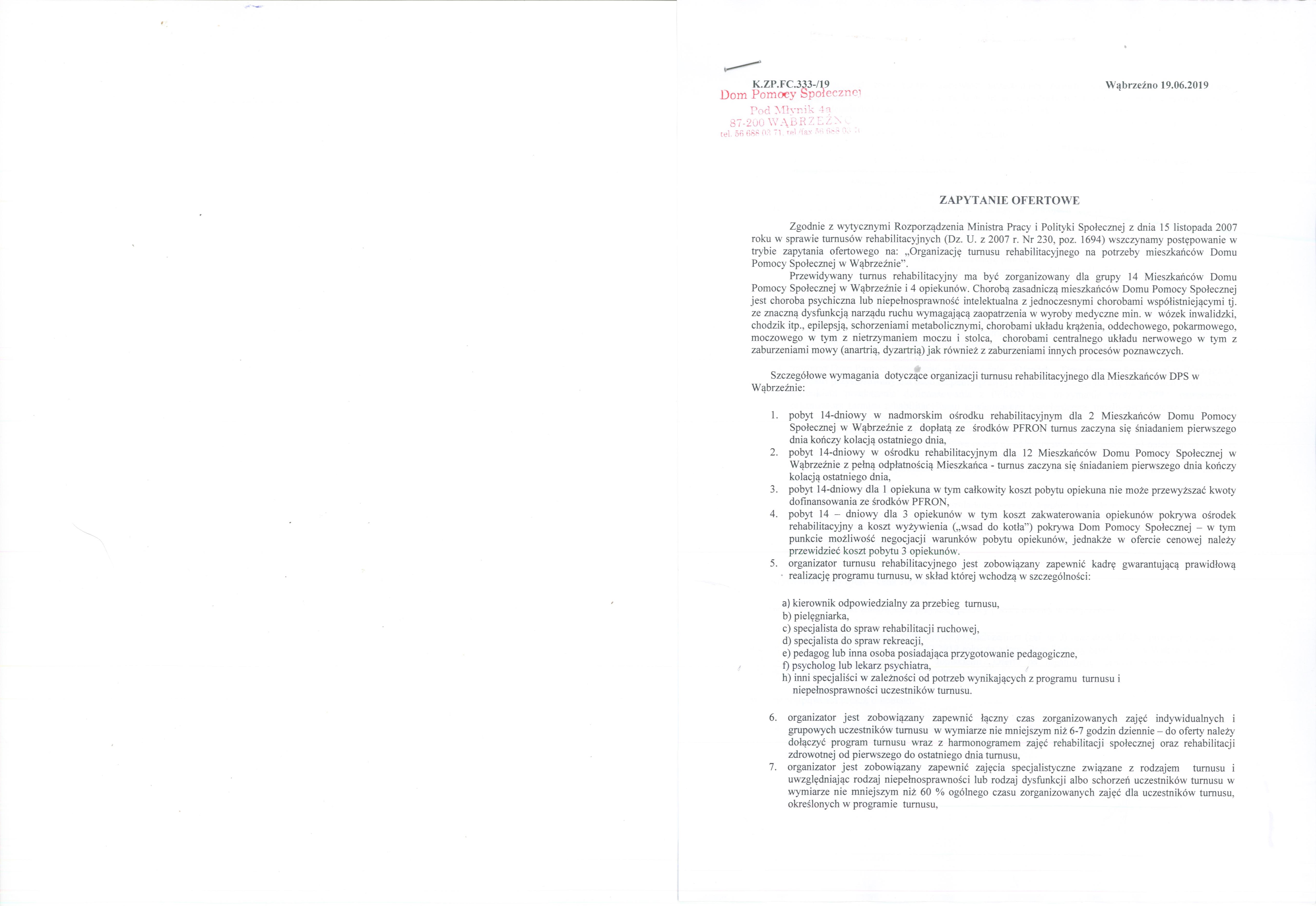 Zgodnie z wytycznymi Rozporządzenia Ministra Pracy i Polityki Społecznej z dnia 15 listopada 2007 roku w sprawie turnusów rehabilitacyjnych (Dz. U. z 2007 r. Nr 230, poz. 1694) wszczynamy postępowanie w trybie zapytania ofertowego na: „Organizację turnusu rehabilitacyjnego na potrzeby mieszkańców Domu Pomocy Społecznej w Wąbrzeźnie”.