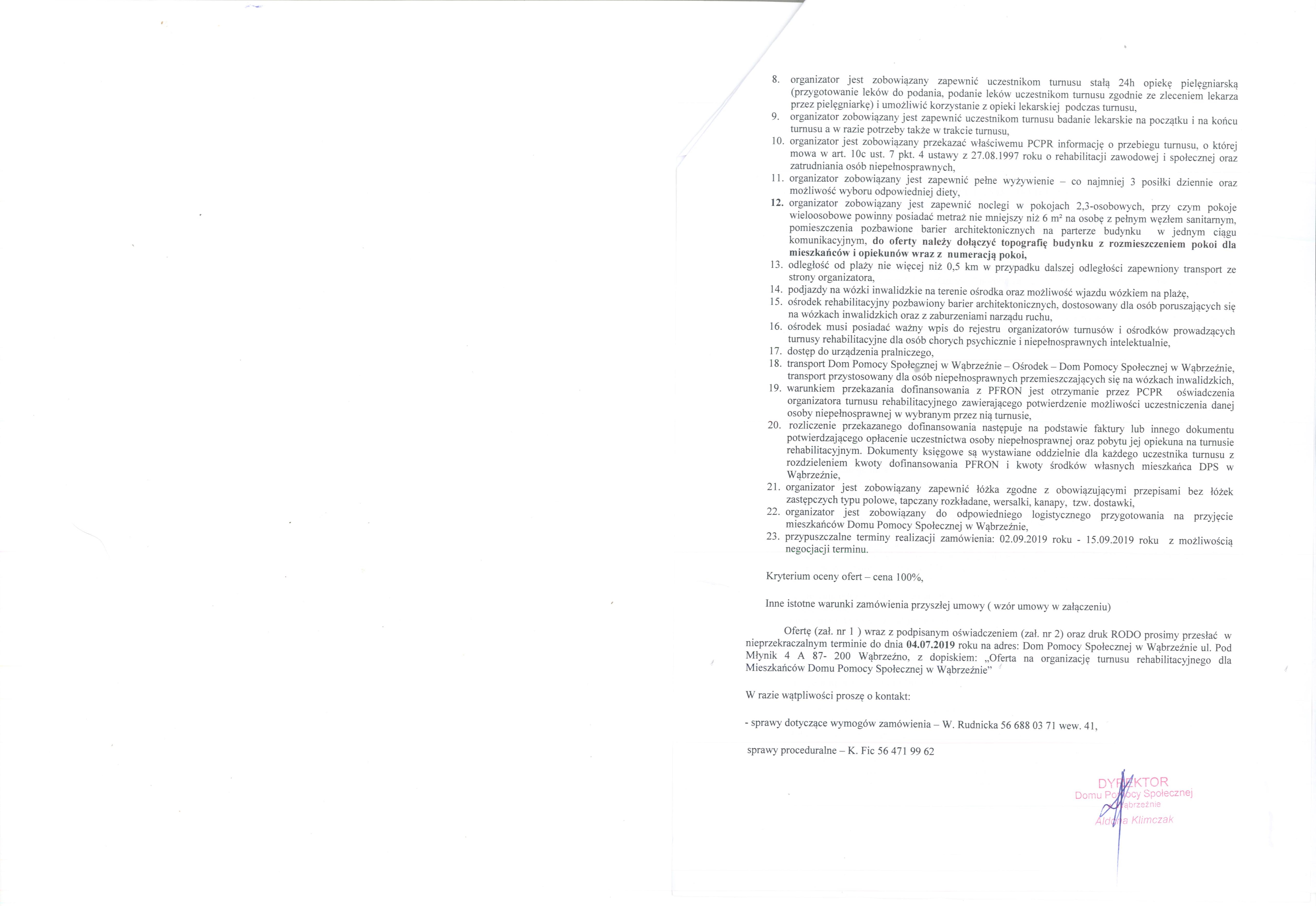 Ofertę (zał. nr 1 ) wraz z podpisanym oświadczeniem (zał. nr 2) oraz druk RODO prosimy przesłać w nieprzekraczalnym terminie do dnia 04.07.2019 roku na adres: Dom Pomocy Społecznej w Wąbrzeźnie ul. Pod Młynik 4 A 87- 200 Wąbrzeźno, z dopiskiem: „Oferta na organizację turnusu rehabilitacyjnego dla Mieszkańców Domu Pomocy Społecznej w Wąbrzeźnie”