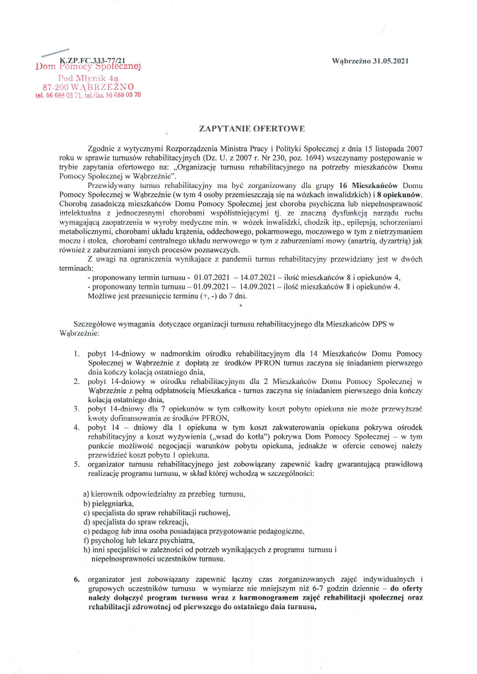 Zgodnie z wytycznymi Rozporządzenia Ministra Pracy i Polityki Społecznej z dnia 15 listopada 2007 roku w sprawie turnusów rehabilitacyjnych (Dz. U. z 2007 r. Nr 230, poz. 1694) wszczynamy postępowanie w trybie zapytania ofertowego na: „Organizację turnusu rehabilitacyjnego na potrzeby mieszkańców Domu Pomocy Społecznej w Wąbrzeźnie”.