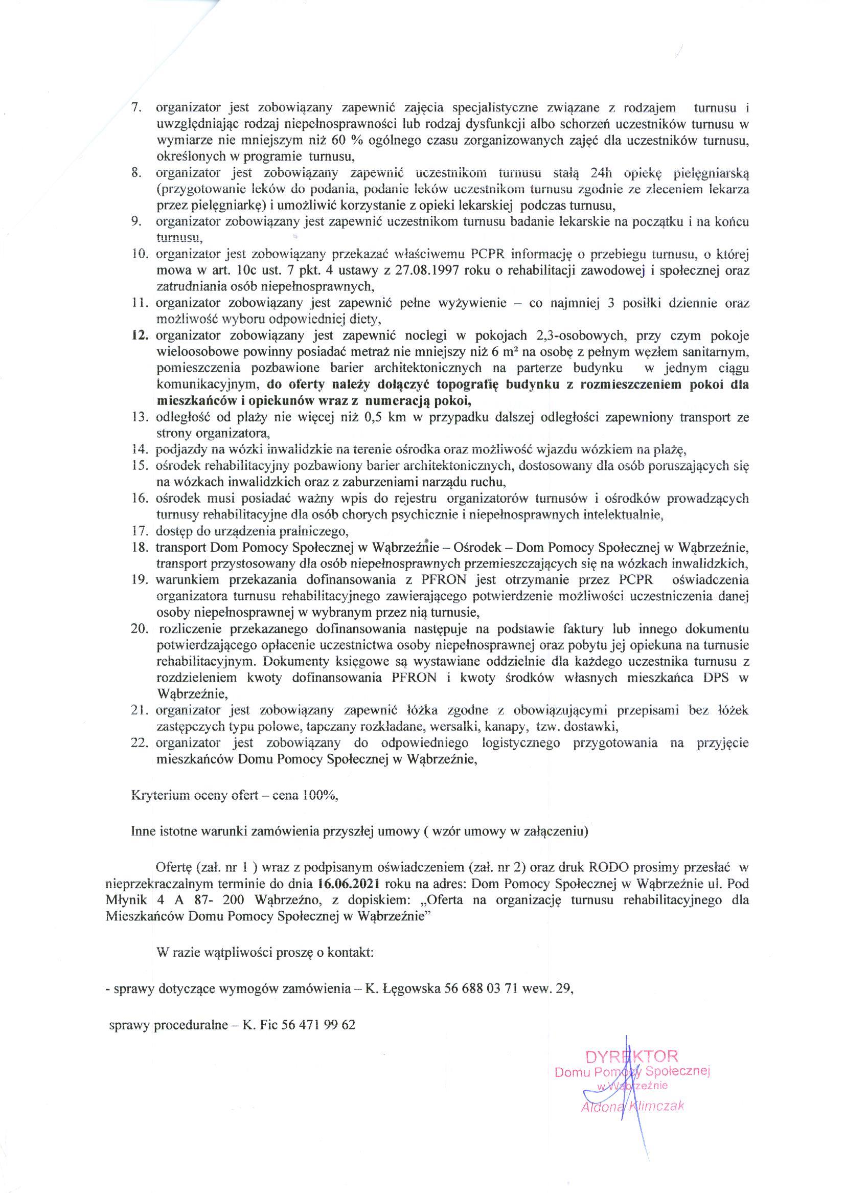 Ofertę (zał. nr 1 ) wraz z podpisanym oświadczeniem (zał. nr 2) oraz druk RODO prosimy przesłać w nieprzekraczalnym terminie do dnia 16.06.2021 roku na adres: Dom Pomocy Społecznej w Wąbrzeźnie ul. Pod Młynik 4 A 87- 200 Wąbrzeźno, z dopiskiem: „Oferta na organizację turnusu rehabilitacyjnego dla Mieszkańców Domu Pomocy Społecznej w Wąbrzeźnie”