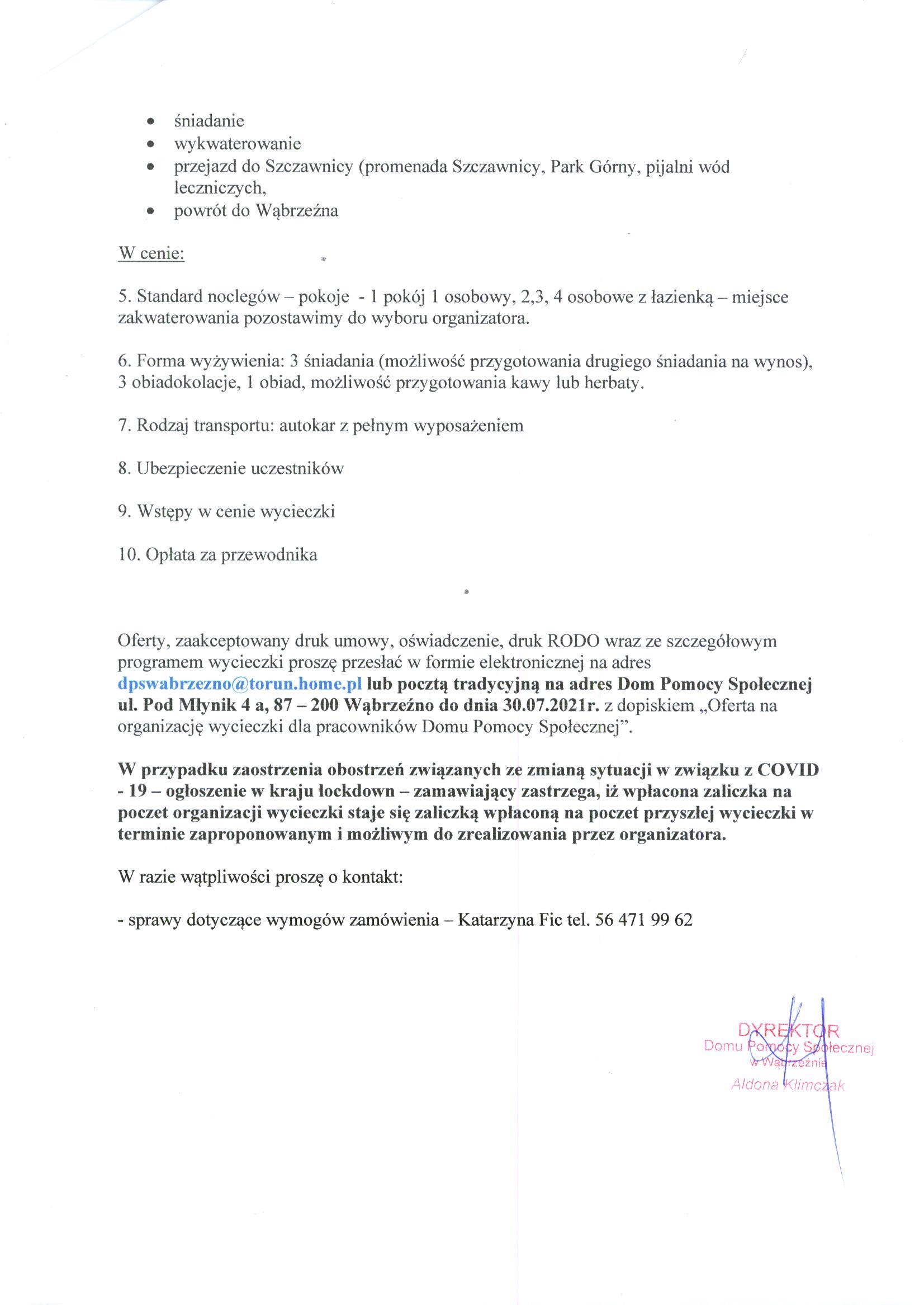 Oferty, zaakceptowany druk umowy, oświadczenie, druk RODO wraz ze szczegółowym programem wycieczki proszę przesłać w formie elektronicznej na adres dpswabrzezno[at]torun[dot]home[dot]pl lub pocztą tradycyjną na adres Dom Pomocy Społecznej ul. Pod Młynik 4 a, 87 – 200 Wąbrzeźno do dnia 30.07.2021r. z dopiskiem „Oferta na organizację wycieczki dla pracowników Domu Pomocy Społecznej”.