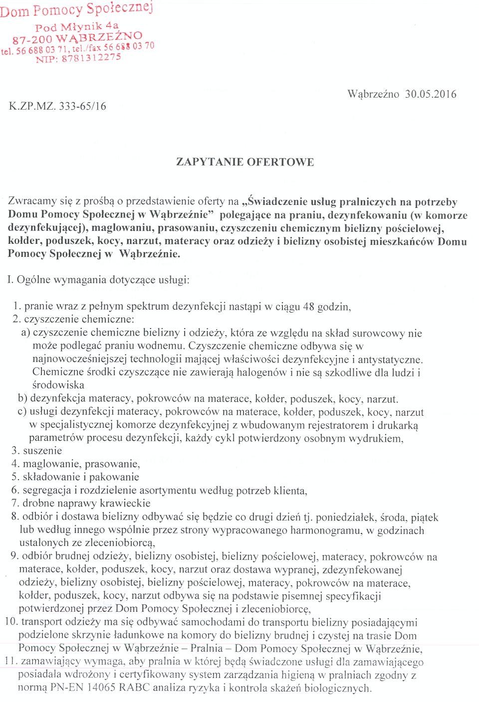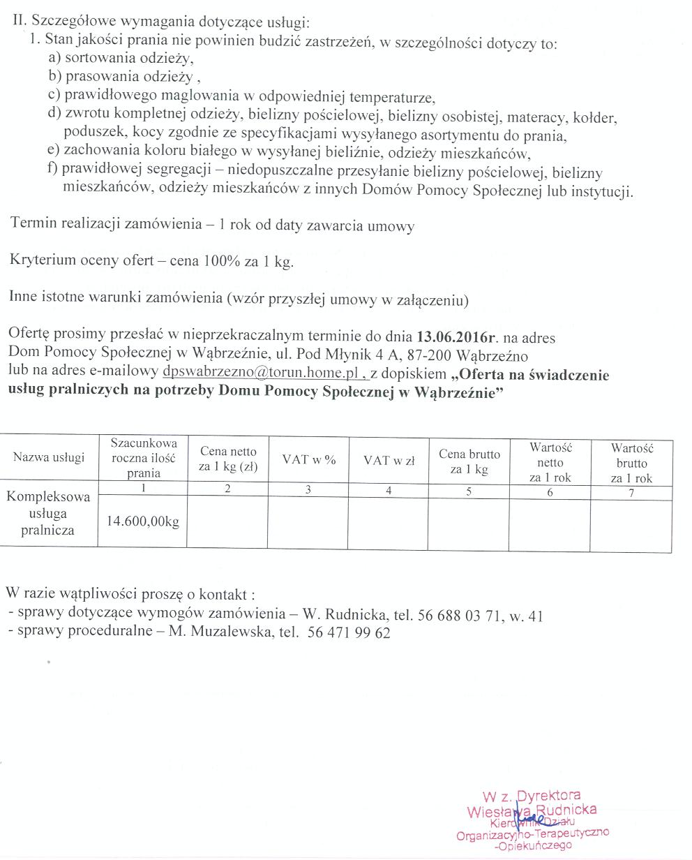 Zwracamy się z prośbą o przedstawienie oferty na „Świadczenie usług pralniczych na potrzeby Domu Pomocy Społecznej w Wąbrzeźnie” polegające na praniu, dezynfekowaniu (w komorze dezynfekującej), maglowaniu, prasowaniu, czyszczeniu chemicznym bielizny pościelowej, kołder, poduszek, kocy, narzut, materacy oraz odzieży i bielizny osobistej mieszkańców Domu Pomocy Społecznej w Wąbrzeźnie.