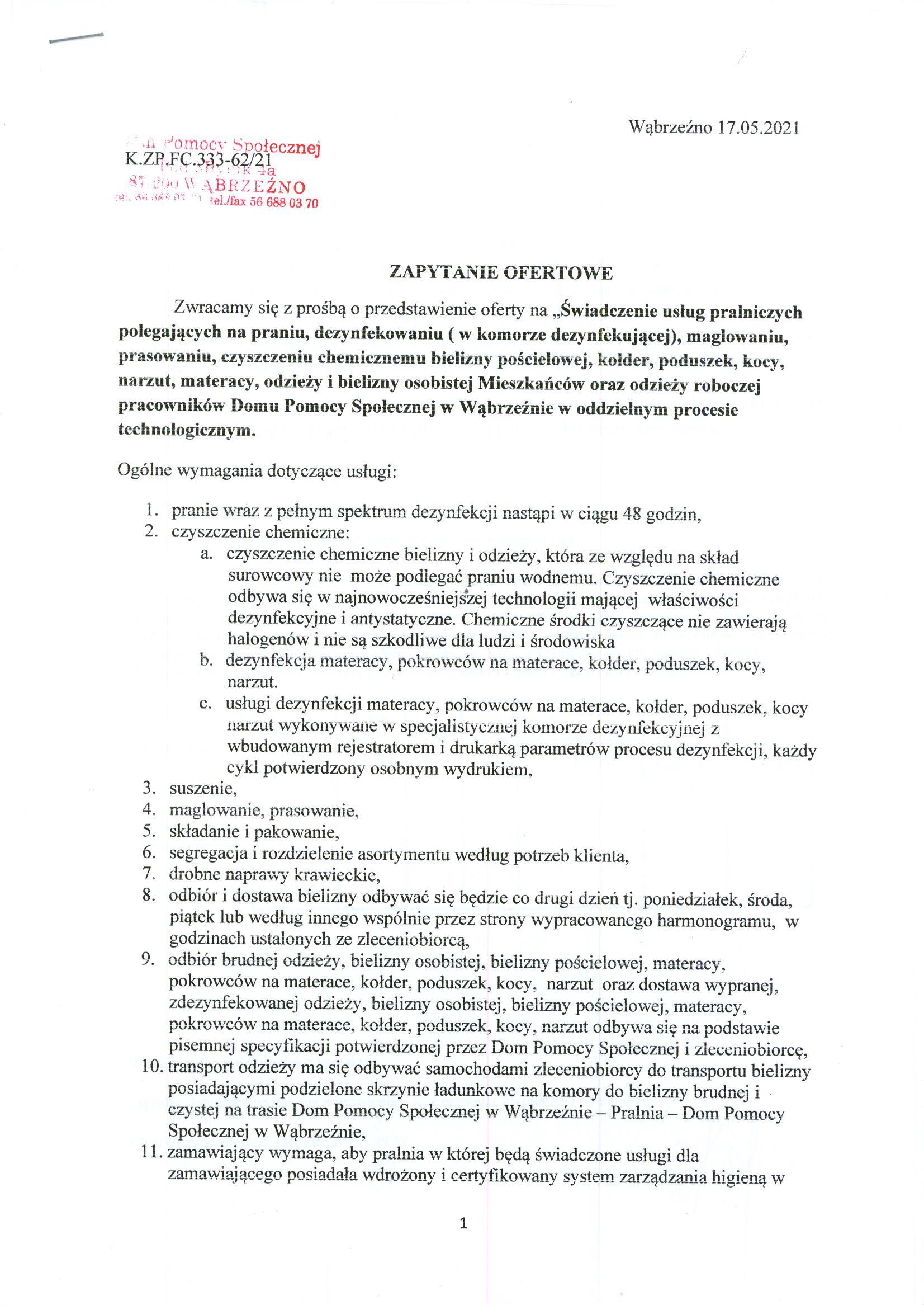 Zwracamy się z prośbą o przedstawienie oferty na „Świadczenie usług pralniczych polegających na praniu, dezynfekowaniu ( w komorze dezynfekującej), maglowaniu, prasowaniu, czyszczeniu chemicznemu bielizny pościelowej, kołder, poduszek, kocy, narzut, materacy, odzieży i bielizny osobistej Mieszkańców oraz odzieży roboczej pracowników Domu Pomocy Społecznej w Wąbrzeźnie w oddzielnym procesie technologicznym.