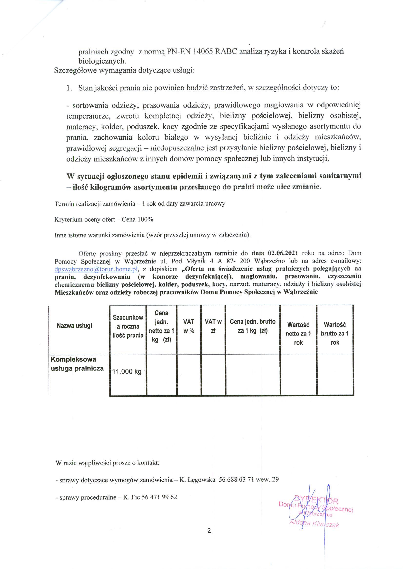 Ofertę prosimy przesłać w nieprzekraczalnym terminie do dnia 02.06.2021 roku na adres: Dom Pomocy Społecznej w Wąbrzeźnie ul. Pod Młynik 4 A 87- 200 Wąbrzeźno lub na adres e-mailowy: dpswabrzezno[at]torun[dot]home[dot]pl, z dopiskiem „Oferta na świadczenie usług pralniczych polegających na praniu, dezynfekowaniu (w komorze dezynfekującej), maglowaniu, prasowaniu, czyszczeniu chemicznemu bielizny pościelowej, kołder, poduszek, kocy, narzut, materacy, odzieży i bielizny osobistej Mieszkańców oraz odzieży roboczej pracowników Domu Pomocy Społecznej w Wąbrzeźnie