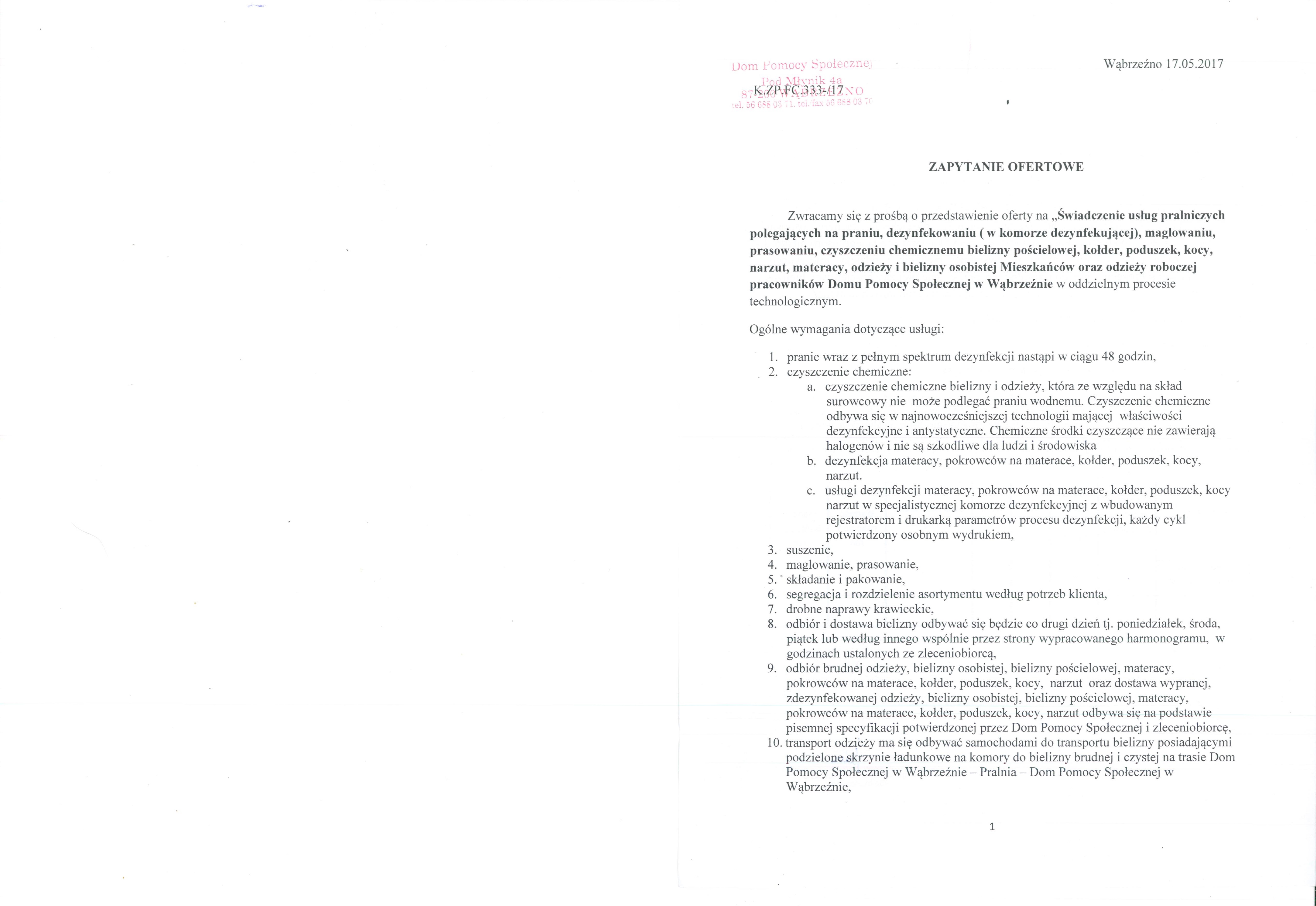 Zwracamy się z prośbą o przedstawienie oferty na „Świadczenie usług pralniczych polegających na praniu, dezynfekowaniu ( w komorze dezynfekującej), maglowaniu, prasowaniu, czyszczeniu chemicznemu bielizny pościelowej, kołder, poduszek, kocy, narzut, materacy, odzieży i bielizny osobistej Mieszkańców oraz odzieży roboczej pracowników Domu Pomocy Społecznej w Wąbrzeźnie w oddzielnym procesie technologicznym.