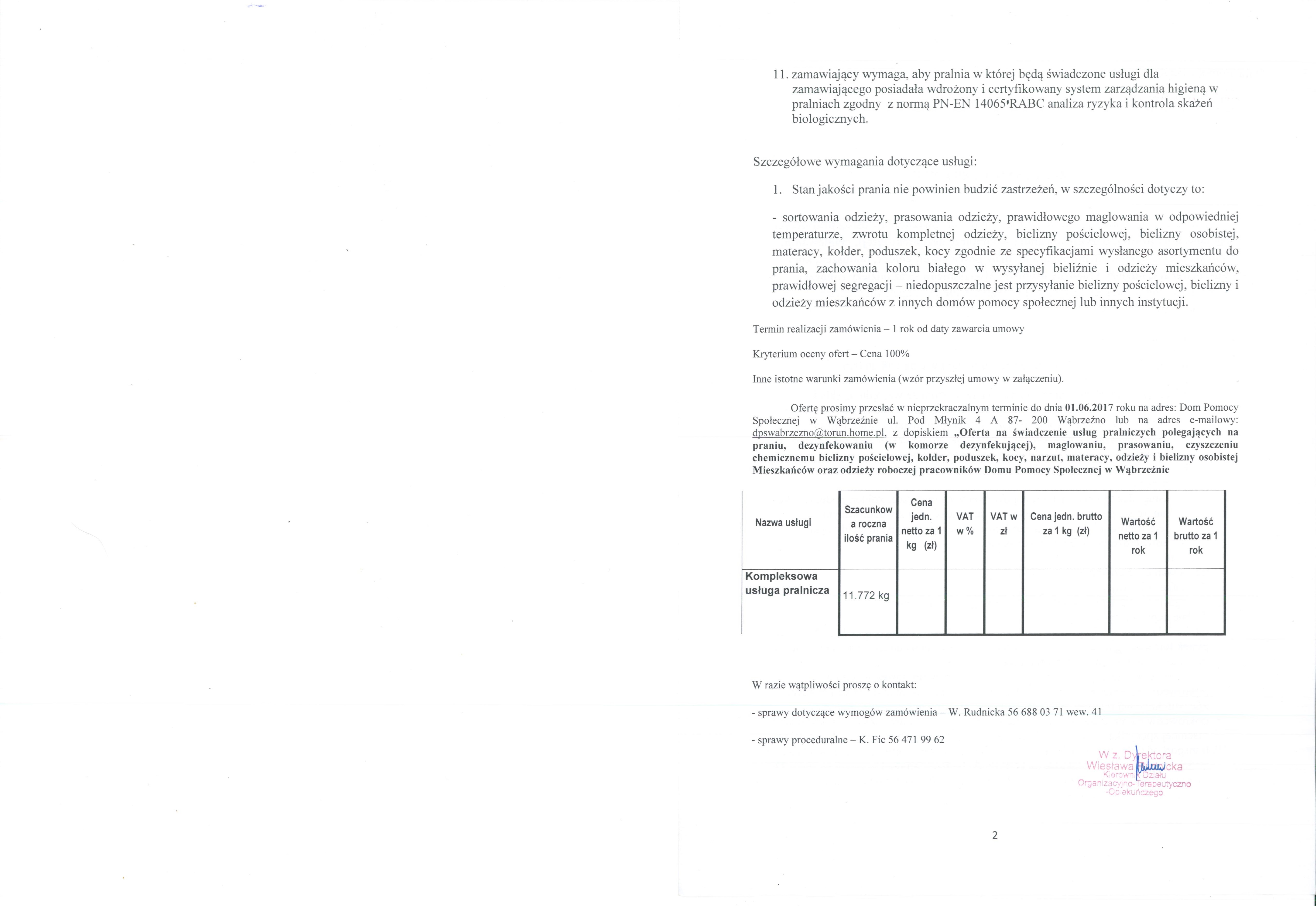 Ofertę prosimy przesłać w nieprzekraczalnym terminie do dnia 01.06.2017 roku na adres: Dom Pomocy Społecznej w Wąbrzeźnie ul. Pod Młynik 4 A 87- 200 Wąbrzeźno lub na adres e-mailowy: dpswabrzezno[at]torun[dot]home[dot]pl, z dopiskiem „Oferta na świadczenie usług pralniczych polegających na praniu, dezynfekowaniu (w komorze dezynfekującej), maglowaniu, prasowaniu, czyszczeniu chemicznemu bielizny pościelowej, kołder, poduszek, kocy, narzut, materacy, odzieży i bielizny osobistej Mieszkańców oraz odzieży roboczej pracowników Domu Pomocy Społecznej w Wąbrzeźnie