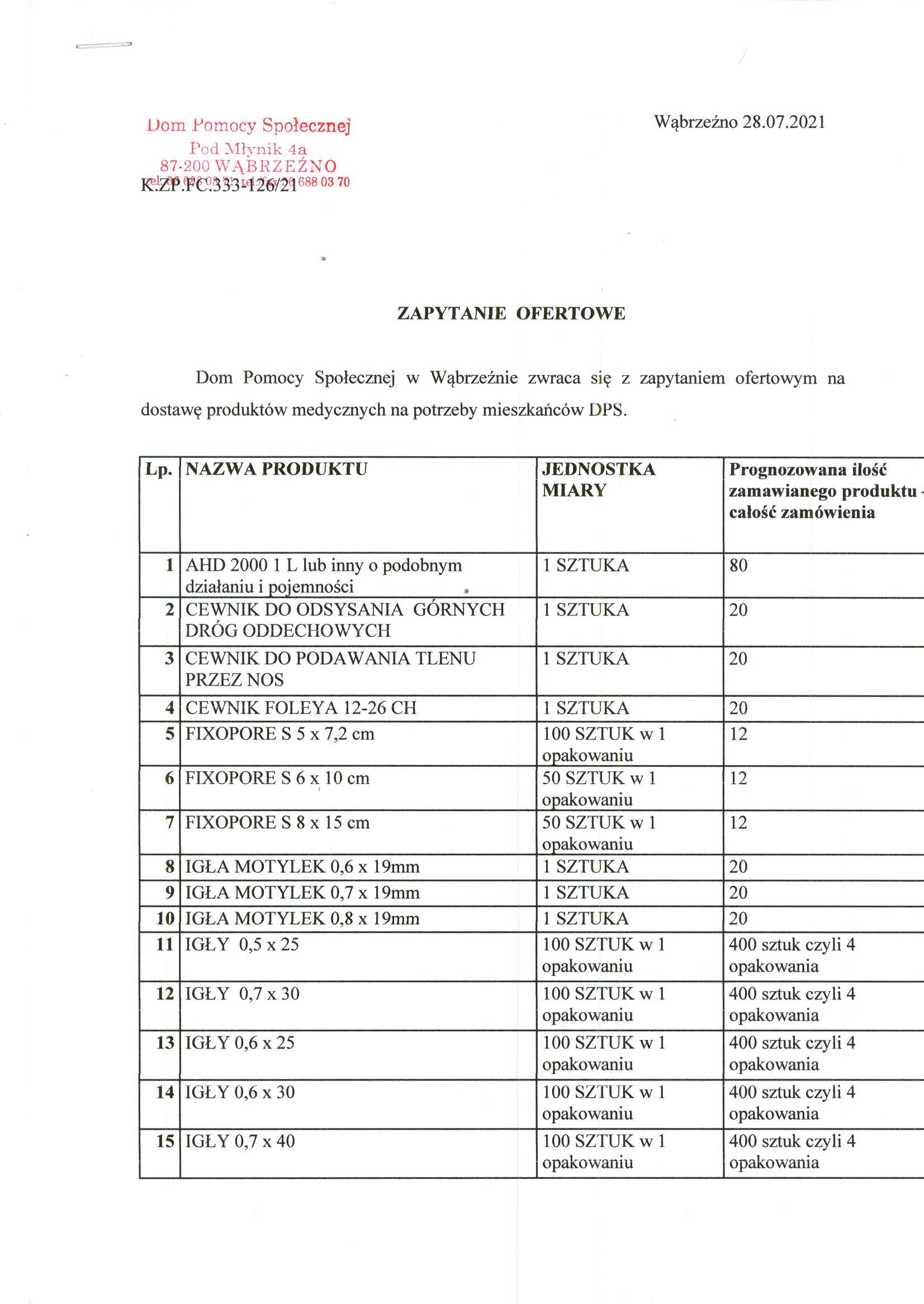 Dom Pomocy Społecznej w Wąbrzeźnie zwraca się z zapytaniem ofertowym na dostawę produktów medycznych na potrzeby mieszkańców DPS.