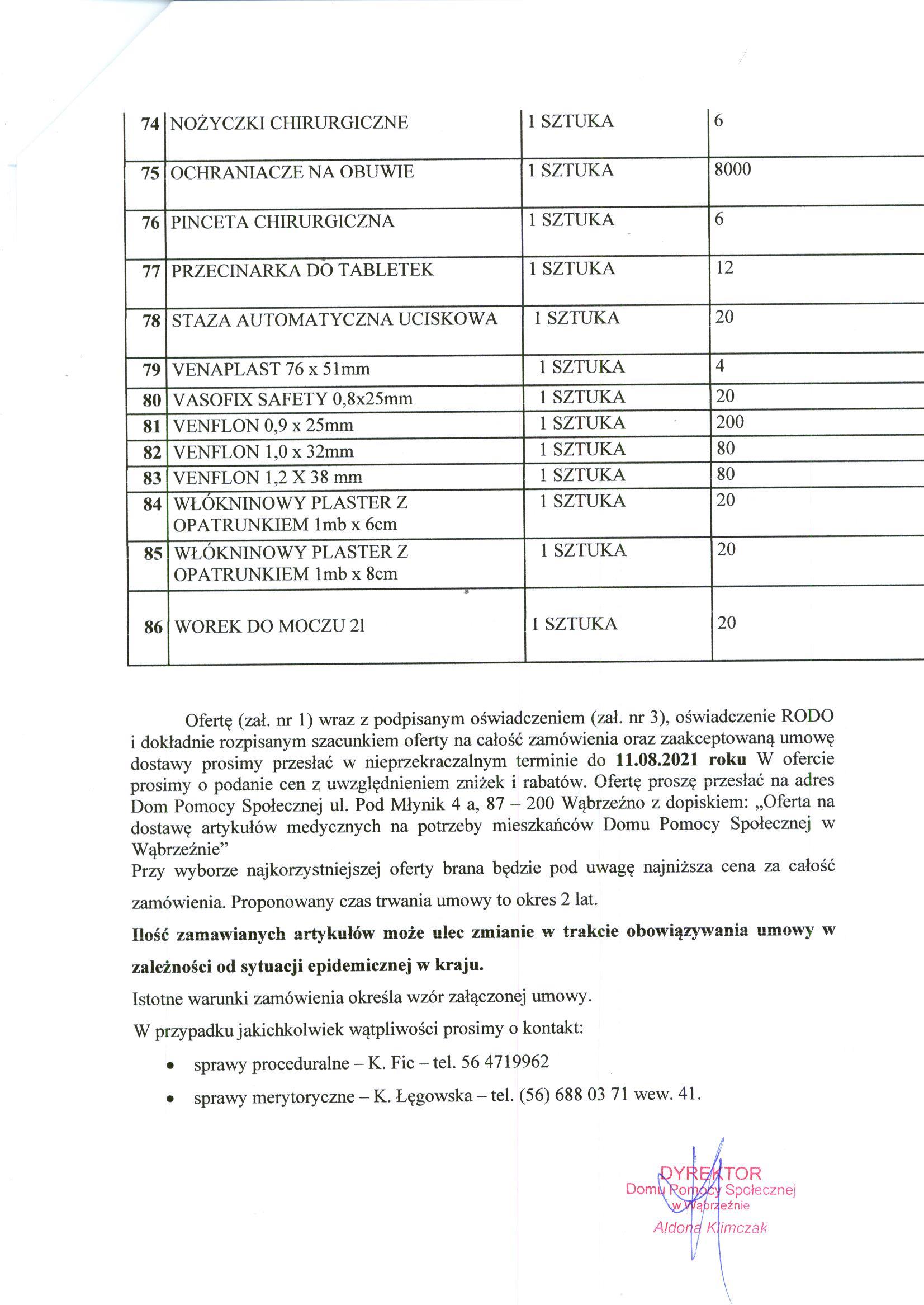 Ofertę (zał. nr 1) wraz z podpisanym oświadczeniem (zał. nr 3), oświadczenie RODO i dokładnie rozpisanym szacunkiem oferty na całość zamówienia oraz zaakceptowaną umowę dostawy prosimy przesłać w nieprzekraczalnym terminie do 11.08.2021 roku W ofercie prosimy o podanie cen z uwzględnieniem zniżek i rabatów. Ofertę proszę przesłać na adres Dom Pomocy Społecznej ul. Pod Młynik 4 a, 87 – 200 Wąbrzeźno z dopiskiem: „Oferta na dostawę artykułów medycznych na potrzeby mieszkańców Domu Pomocy Społecznej w Wąbrzeźnie”