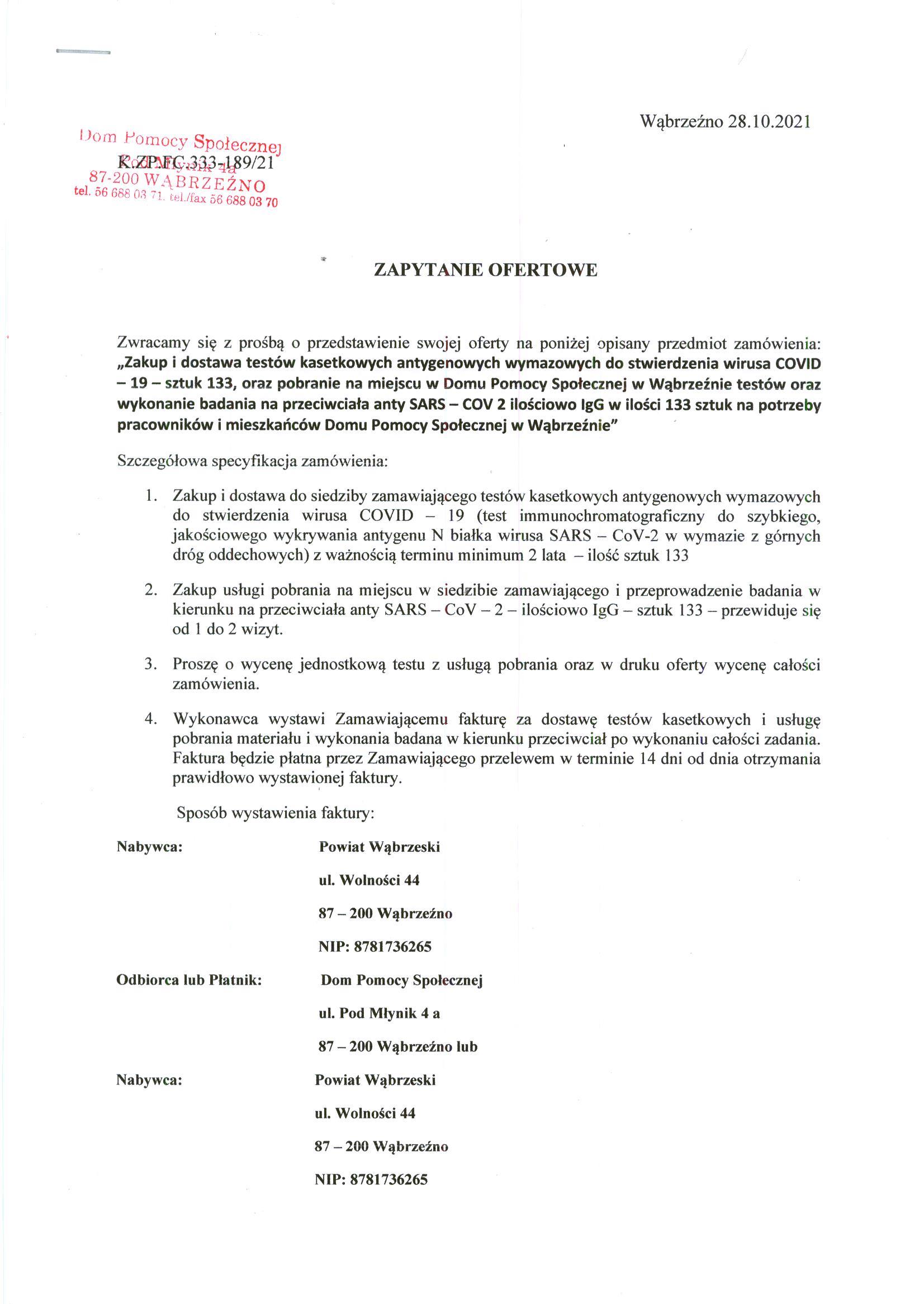 Zwracamy się z prośbą o przedstawienie swojej oferty na poniżej opisany przedmiot zamówienia: „Zakup i dostawa testów kasetkowych antygenowych wymazowych do stwierdzenia wirusa COVID – 19 – sztuk 133, oraz pobranie na miejscu w Domu Pomocy Społecznej w Wąbrzeźnie testów oraz wykonanie badania na przeciwciała anty SARS – COV 2 ilościowo IgG w ilości 133 sztuk na potrzeby pracowników i mieszkańców Domu Pomocy Społecznej w Wąbrzeźnie”