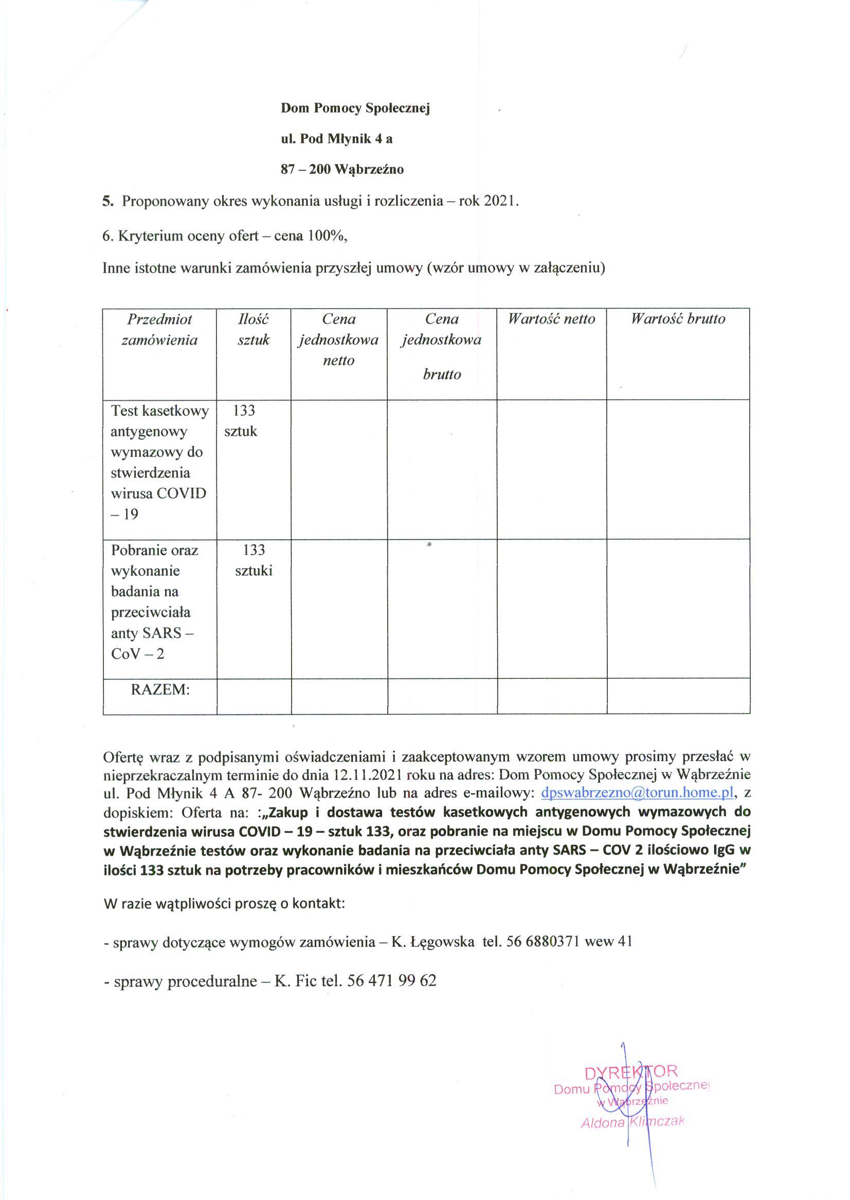 Ofertę wraz z podpisanymi oświadczeniami i zaakceptowanym wzorem umowy prosimy przesłać w nieprzekraczalnym terminie do dnia 12.11.2021 roku na adres: Dom Pomocy Społecznej w Wąbrzeźnie ul. Pod Młynik 4 A 87- 200 Wąbrzeźno lub na adres e-mailowy: dpswabrzezno[at]torun[dot]home[dot]pl, z dopiskiem: Oferta na: :„Zakup i dostawa testów kasetkowych antygenowych wymazowych do stwierdzenia wirusa COVID – 19 – sztuk 133, oraz pobranie na miejscu w Domu Pomocy Społecznej w Wąbrzeźnie testów oraz wykonanie badania na przeciwciała anty SARS – COV 2 ilościowo IgG w ilości 133 sztuk na potrzeby pracowników i mieszkańców Domu Pomocy Społecznej w Wąbrzeźnie”