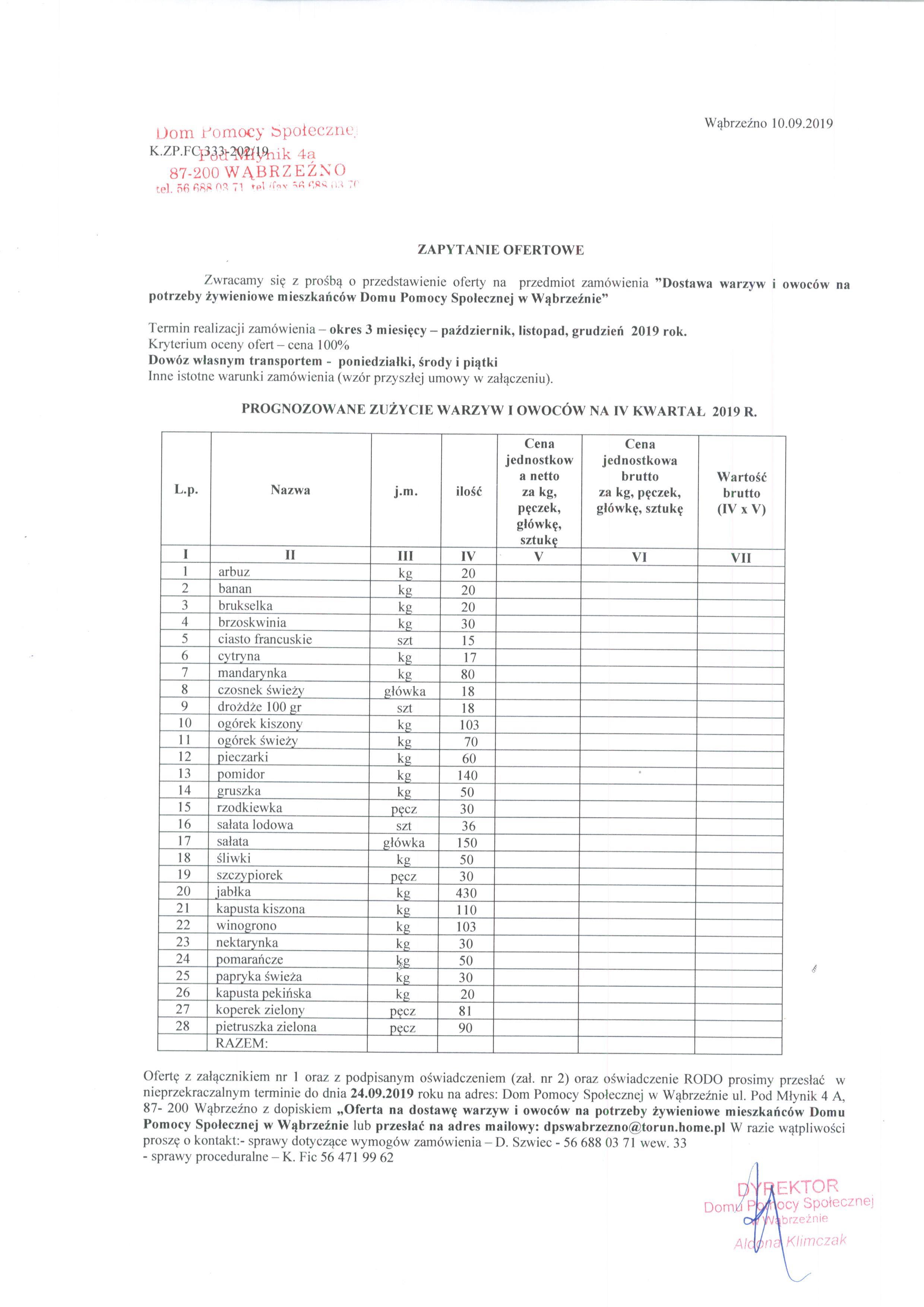 Ofertę z załącznikiem nr 1 oraz z podpisanym oświadczeniem (zał. nr 2) oraz oświadczenie RODO prosimy przesłać w nieprzekraczalnym terminie do dnia 24.09.2019 roku na adres: Dom Pomocy Społecznej w Wąbrzeźnie ul. Pod Młynik 4 A, 87- 200 Wąbrzeźno z dopiskiem „Oferta na dostawę warzyw i owoców na potrzeby żywieniowe mieszkańców Domu Pomocy Społecznej w Wąbrzeźnie lub przesłać na adres mailowy: dpswabrzezno[at]torun[dot]home[dot]pl W razie wątpliwości proszę o kontakt:- sprawy dotyczące wymogów zamówienia – D. Szwiec – 56 688 03 71 wew. 33