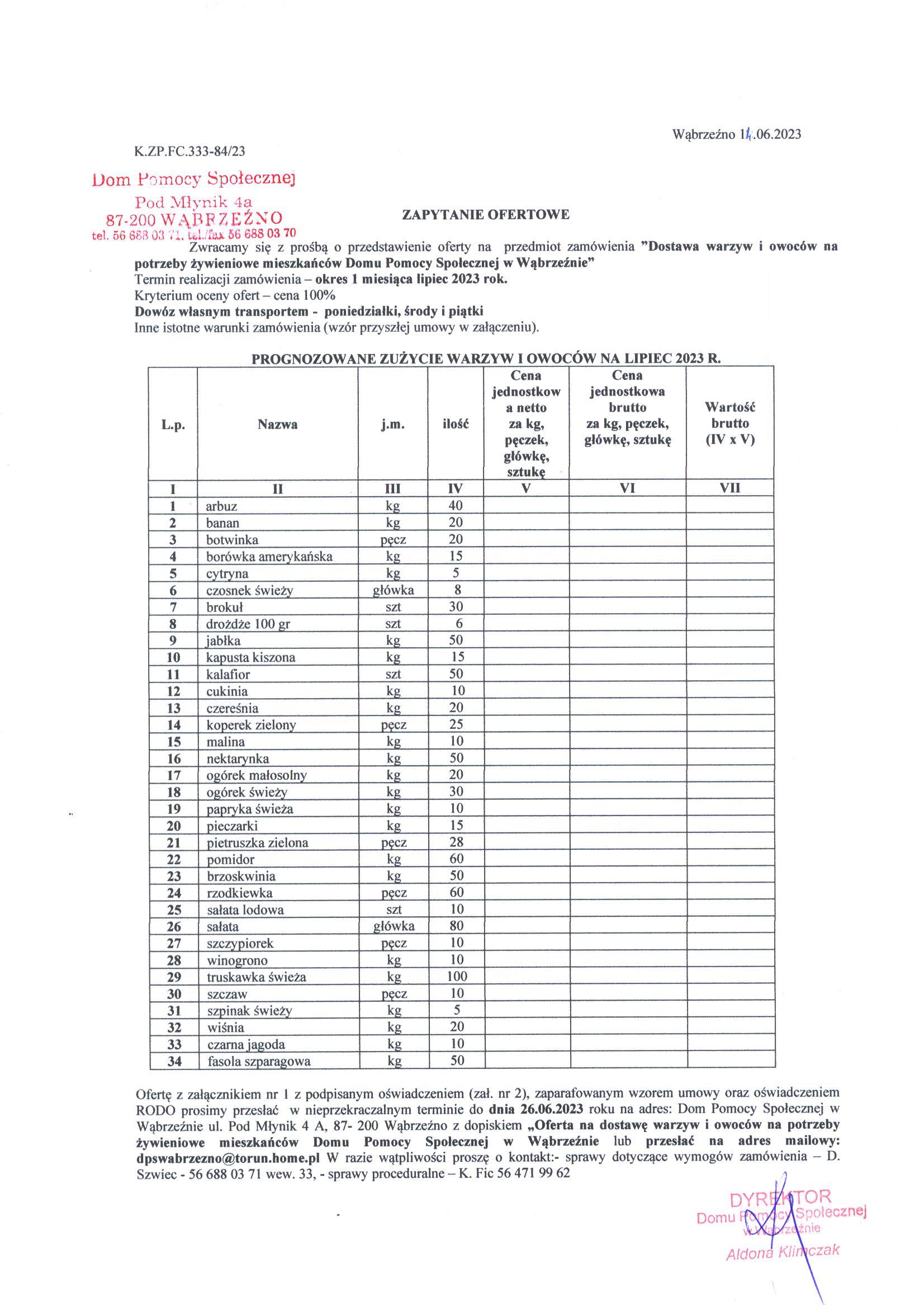 Ofertę z załącznikiem nr 1 z podpisanym oświadczeniem (zał. nr 2), zaparafowanym wzorem umowy oraz oświadczeniem RODO prosimy przesłać  w nieprzekraczalnym terminie do dnia 26.06.2023 roku na adres: Dom Pomocy Społecznej w Wąbrzeźnie ul. Pod Młynik 4 A, 87- 200 Wąbrzeźno z dopiskiem „Oferta na dostawę warzyw i owoców na potrzeby żywieniowe mieszkańców Domu Pomocy Społecznej w Wąbrzeźnie lub przesłać na adres mailowy: dpswabrzezno[at]torun[dot]home[dot]pl W razie wątpliwości proszę o kontakt:- sprawy dotyczące wymogów zamówienia – D. Szwiec – 56 688 03 71 wew. 33, – sprawy proceduralne – K. Fic 56 471 99 62