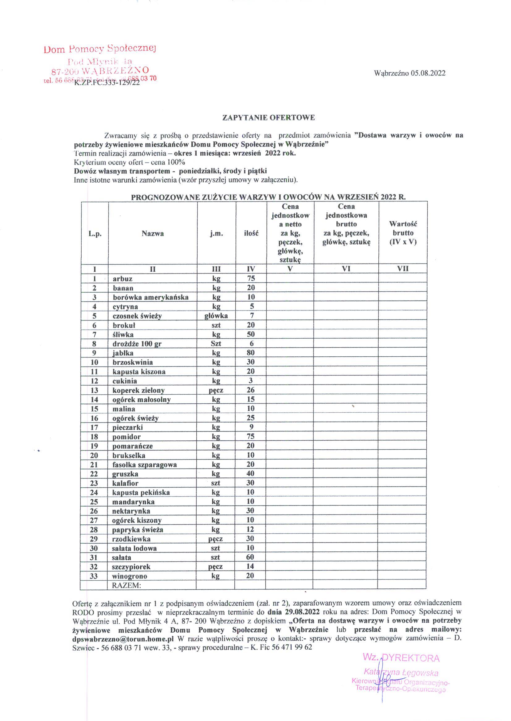 Zwracamy się z prośbą o przedstawienie oferty na przedmiot zamówienia ”Dostawa warzyw i owoców na potrzeby żywieniowe mieszkańców Domu Pomocy Społecznej w Wąbrzeźnie”
