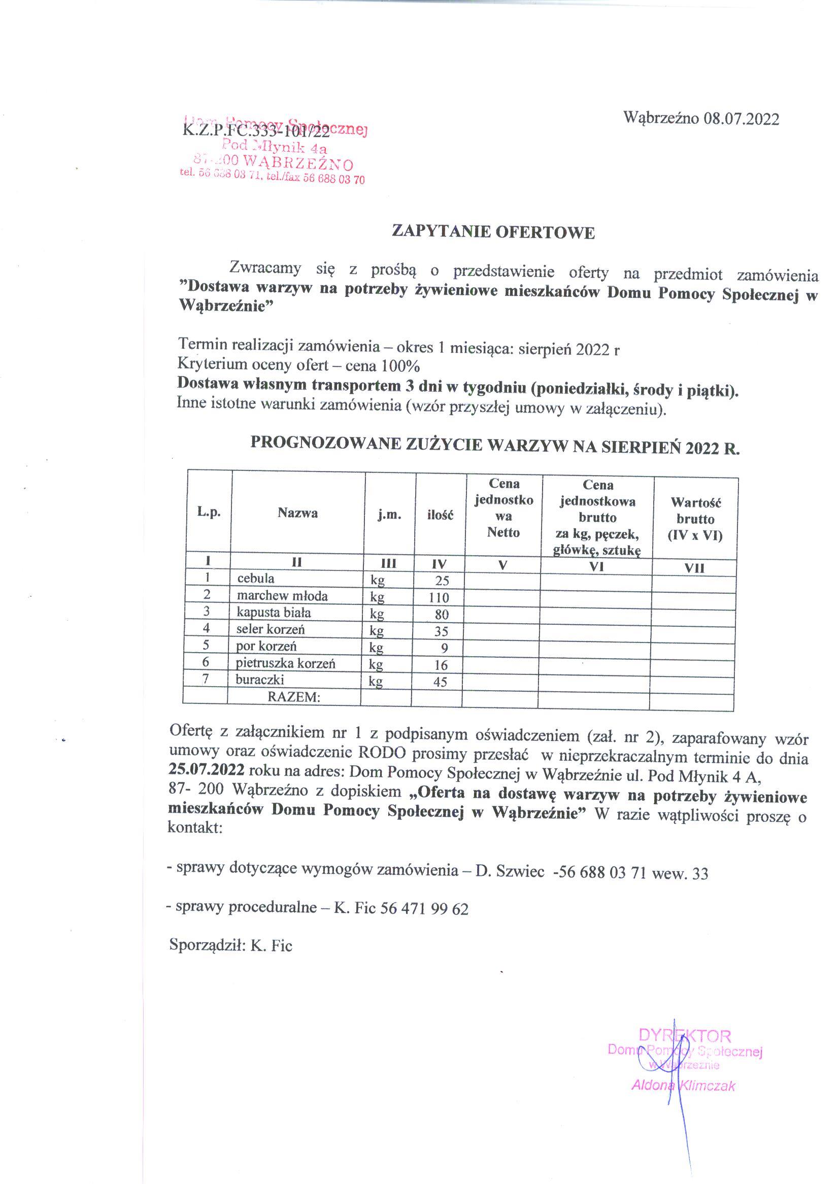 87- 200 Wąbrzeźno z dopiskiem „Oferta na dostawę warzyw na potrzeby żywieniowe mieszkańców Domu Pomocy Społecznej w Wąbrzeźnie” W razie wątpliwości proszę o kontakt: