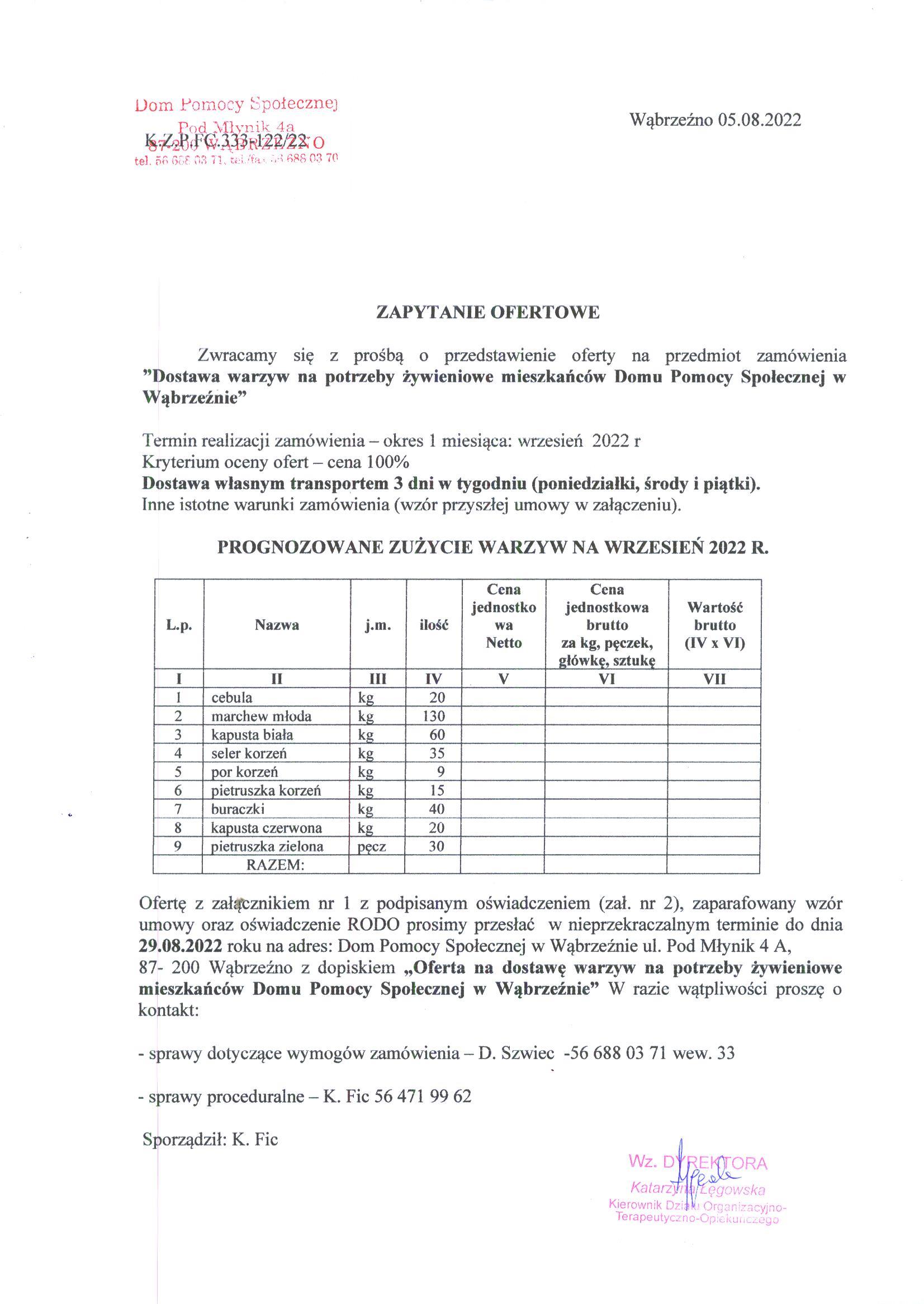 87- 200 Wąbrzeźno z dopiskiem „Oferta na dostawę warzyw na potrzeby żywieniowe mieszkańców Domu Pomocy Społecznej w Wąbrzeźnie” W razie wątpliwości proszę o kontakt: