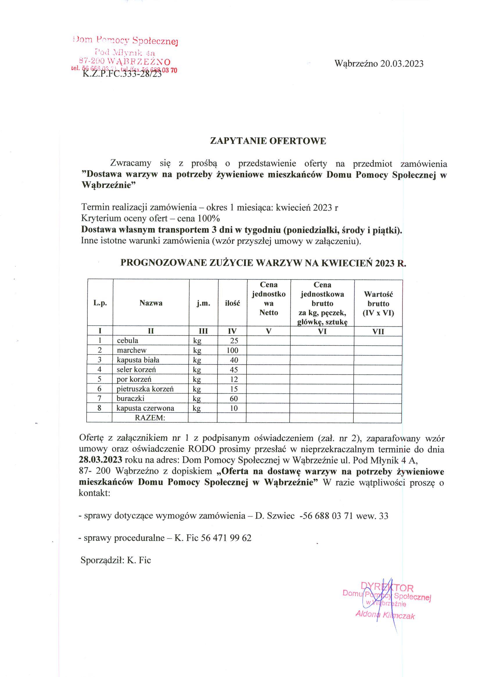 Ofertę z załącznikiem nr 1 z podpisanym oświadczeniem (zał. nr 2), zaparafowany wzór umowy oraz oświadczenie RODO prosimy przesłać w nieprzekraczalnym terminie do dnia 28.03.2023 roku na adres: Dom Pomocy Społecznej w Wąbrzeźnie ul. Pod Młynik 4 A, 87- 200 Wąbrzeźno z dopiskiem „Oferta na dostawę warzyw na potrzeby żywieniowe mieszkańców Domu Pomocy Społecznej w Wąbrzeźnie” W razie wątpliwości proszę o kontakt: