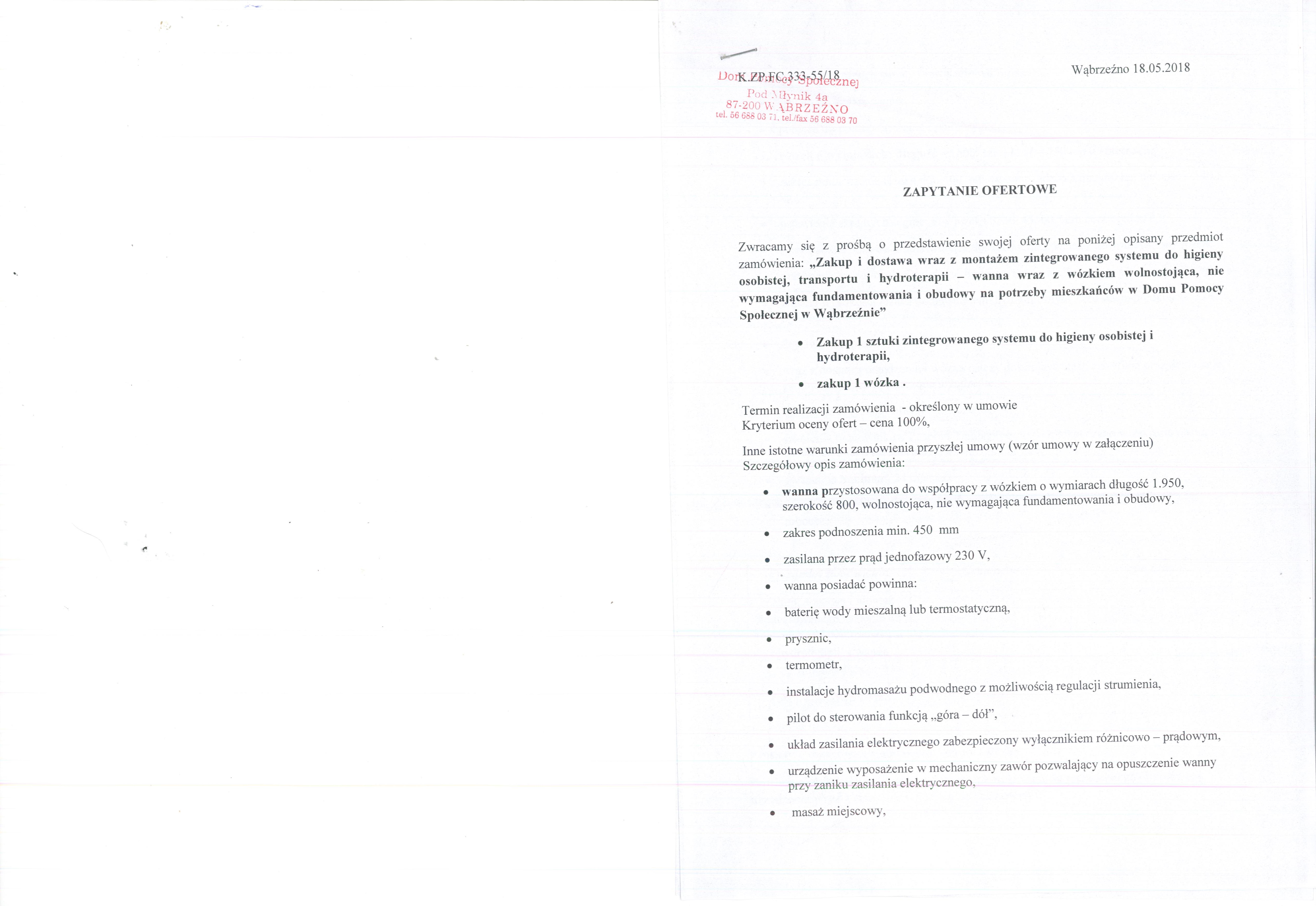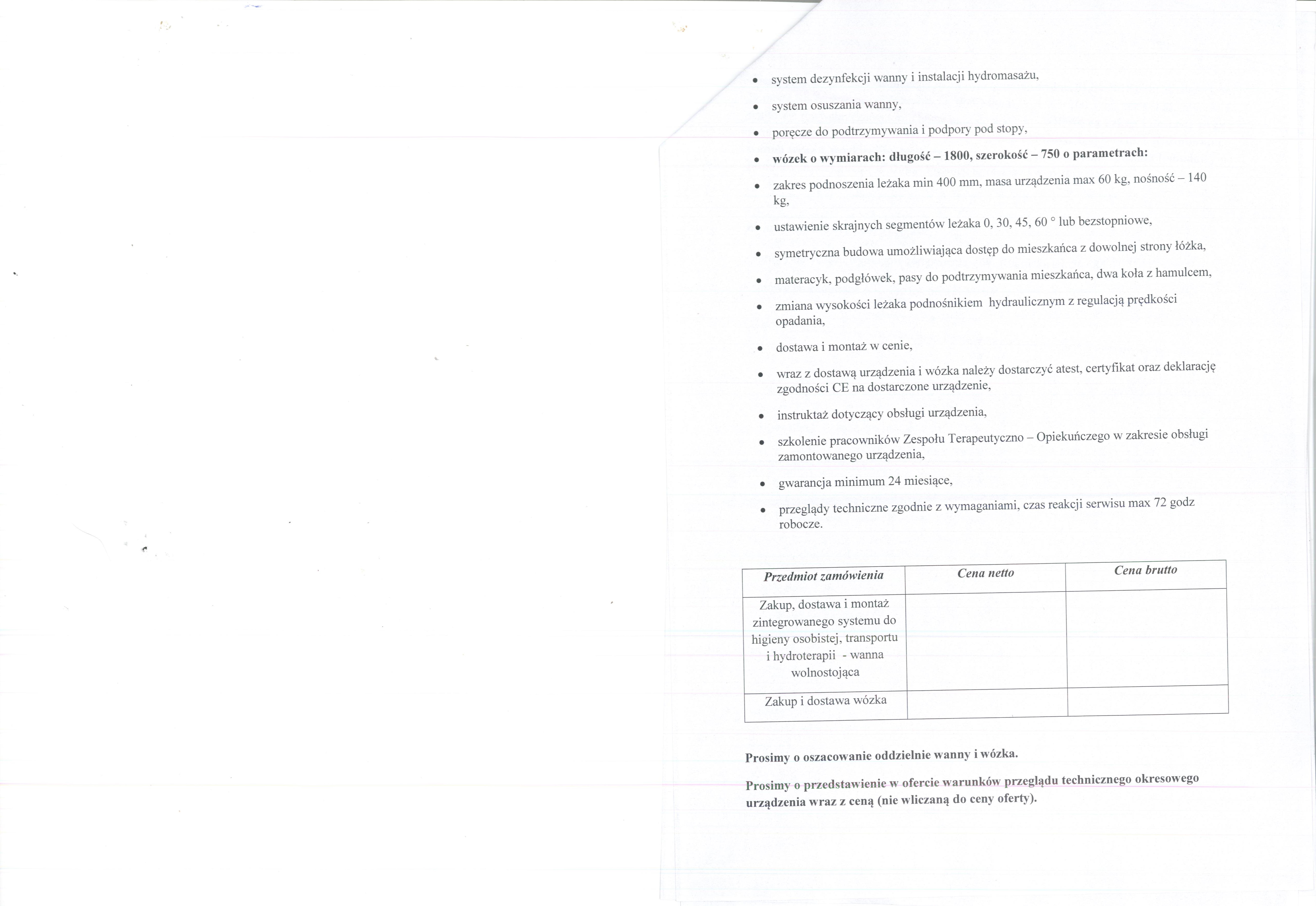 Zwracamy się z prośbą o przedstawienie swojej oferty na poniżej opisany przedmiot zamówienia: Zakup i dostawa wraz z montażem zintegrowanego systemu do higieny osobistej, transportu i hydroterapii – wanna wraz z wózkiem wolnostojąca, nie wymagająca fundamentowania i obudowy na potrzeby mieszkańców w Domu Pomocy Społecznej w Wąbrzeźnie”