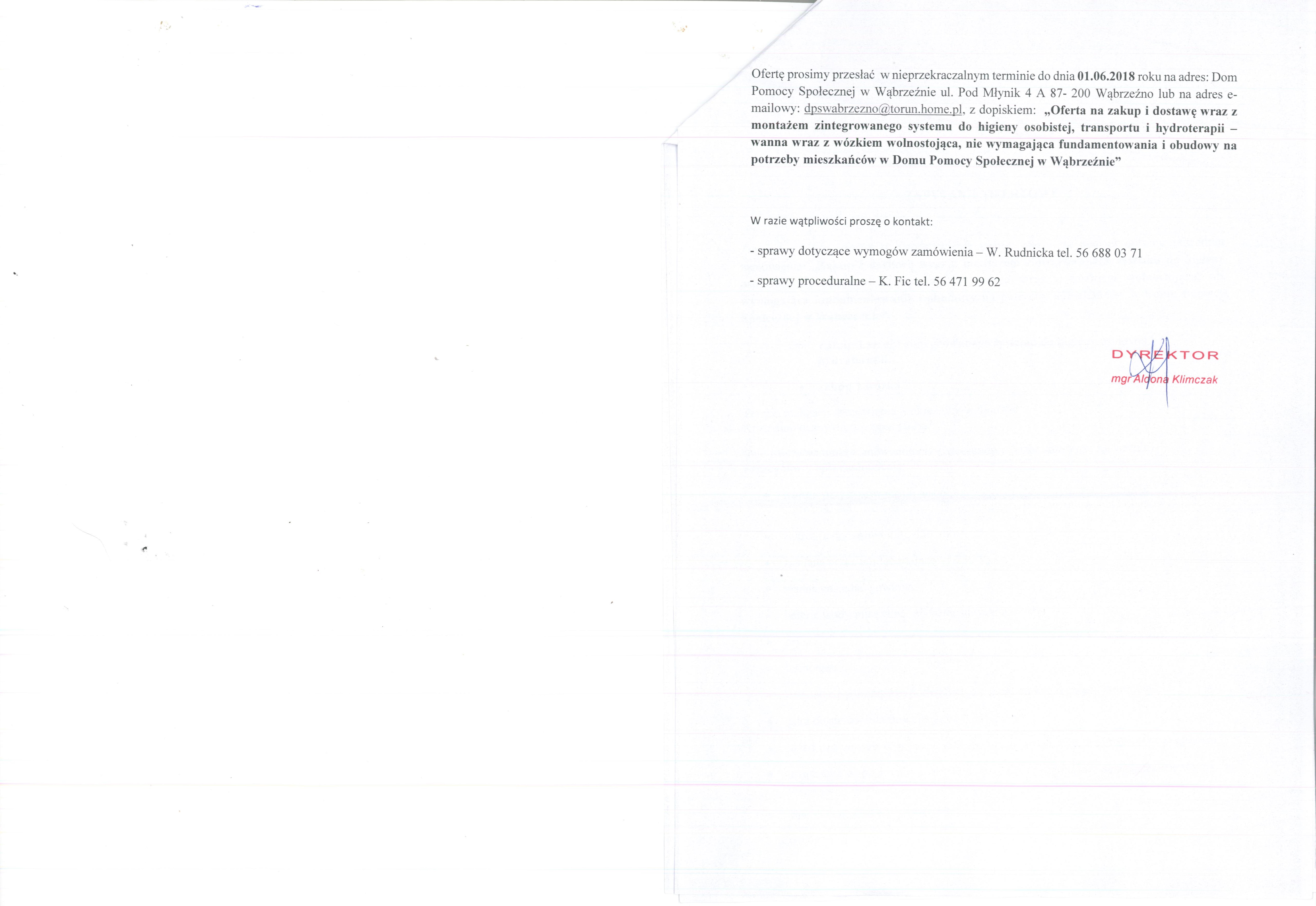 Ofertę prosimy przesłać  w nieprzekraczalnym terminie do dnia 01.06.2018 roku na adres: Dom Pomocy Społecznej w Wąbrzeźnie ul. Pod Młynik 4 A 87- 200 Wąbrzeźno lub na adres e-mailowy: dpswabrzezno[at]torun[dot]home[dot]pl, z dopiskiem:  „Oferta na zakup i dostawę wraz z montażem zintegrowanego systemu do higieny osobistej, transportu i hydroterapii – wanna wraz z wózkiem wolnostojąca, nie wymagająca fundamentowania i obudowy na potrzeby mieszkańców w Domu Pomocy Społecznej w Wąbrzeźnie”