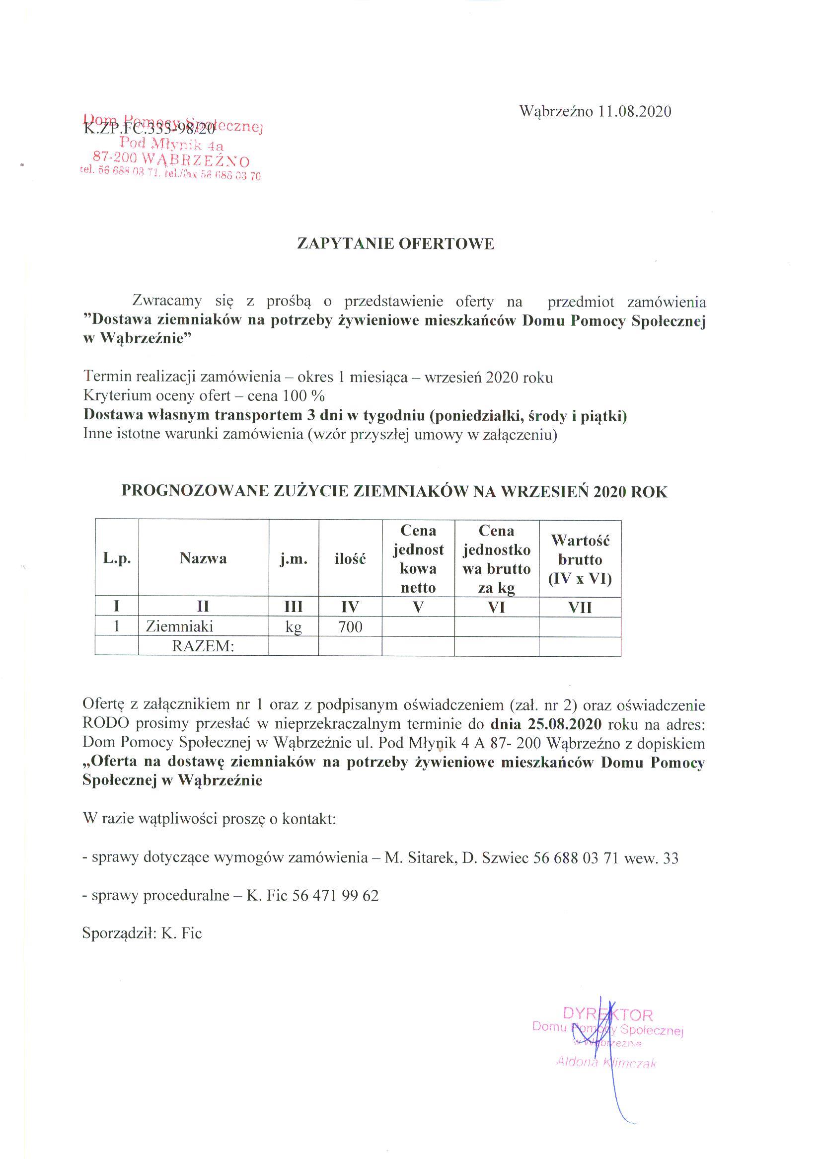 Ofertę z załącznikiem nr 1 oraz z podpisanym oświadczeniem (zał. nr 2) oraz oświadczenie RODO prosimy przesłać w nieprzekraczalnym terminie do dnia 25.08.2020 roku na adres: Dom Pomocy Społecznej w Wąbrzeźnie ul. Pod Młynik 4 A 87- 200 Wąbrzeźno z dopiskiem „Oferta na dostawę ziemniaków na potrzeby żywieniowe mieszkańców Domu Pomocy Społecznej w Wąbrzeźnie