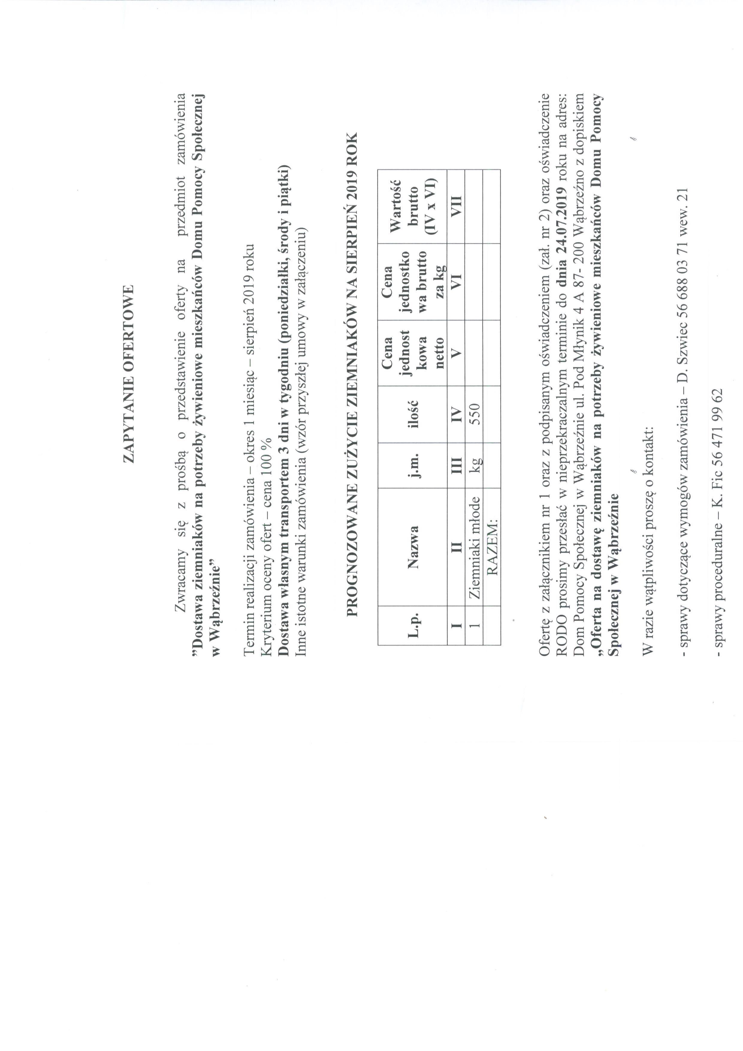 Ofertę z załącznikiem nr 1 oraz z podpisanym oświadczeniem (zał. nr 2) oraz oświadczenie RODO prosimy przesłać w nieprzekraczalnym terminie do dnia 24.07.2019 roku na adres: Dom Pomocy Społecznej w Wąbrzeźnie ul. Pod Młynik 4 A 87- 200 Wąbrzeźno z dopiskiem „Oferta na dostawę ziemniaków na potrzeby żywieniowe mieszkańców Domu Pomocy Społecznej w Wąbrzeźnie
